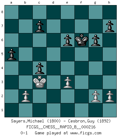 Last move : 0-1 2014 May 17 10:21:22 [Event "FICGS__CHESS__RAPID_B__000216"] [Site "FICGS"] [Date "2014.03.27"] [Round "1"] [White "Sayers,Michael"] [Black "Cesbron,Guy"] [Result "0-1"] [WhiteElo "1800"] [BlackElo "1892"] 1.e4 g6 2.d4 Bg7 3.Nf3 d6 4.Bc4 Nf6 5.e5 dxe5 6.Nxe5 O-O 7.c3 Nbd7 8.Qb3 Nxe5 9.dxe5 Ne4 10.Qb4 Bxe5 11.Bxf7+ Rxf7 12.Qxe4 Qd6 13.Be3 Be6 14.Nd2 Bd5 15.Qg4 Bf4 16.O-O-O Bxe3 17.fxe3 Bxa2 18.c4 b5 19.Qe4 Raf8 20.Nf3 Qc5 21.Qd4 Qxc4+ 22.Qxc4 Bxc4 23.Rd7 e6 24.Rxf7 Rxf7 25.Rd1 a5 26.Ne5 Rf1 27.Nxc4 Rxd1+ 28.Kxd1 bxc4 29.Kc2 Kf7 30.Kc3 Kf6 0-1 Robatsch (Modern) defense Kingside Castling by player Black (move 6) Queenside Castling by player White (move 16) Player Black won this chess game. Follow this game move after move (download)I still hope to kill Fischer. (Boris Spassky) Immer nach dem besten Zug zu suchen ist ziemlich unpraktisch. (Nigel Short) Si yo gano un torneo, yo lo gano por mí mismo. Yo hago las jugadas. Nadie me ayuda. (Bobby Fischer) Karpov est une pièce de musée. (Garry Kasparov) Luck is what you have left over after you give 100 percent. (Langston Coleman)