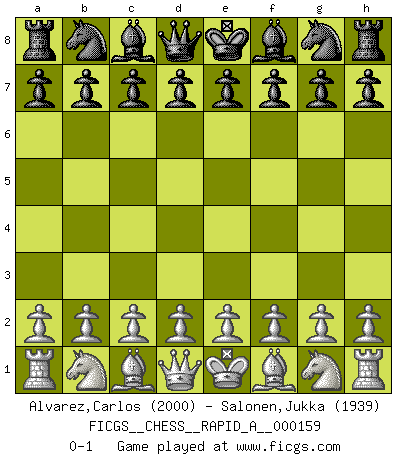Last move : 0-1 2014 April 28 8:33:34 [Event "FICGS__CHESS__RAPID_A__000159"] [Site "FICGS"] [Date "2014.03.28"] [Round "1"] [White "Alvarez,Carlos"] [Black "Salonen,Jukka"] [Result "0-1"] [WhiteElo "2000"] [BlackElo "1939"] 0-1 This chess game has been lost on time (started : 2014.03.28 22:24:30) Player Black won this chess game. Follow this game move after move (download)The passed Pawn is a criminal, who should be kept under lock and key. Mild measures, such as police surveillance, are not sufficient. (Aaron Nimzovich) Die Idee von Capablanca, Schach als Fach in den Schulen zu lehren, ist großartig. (Fidel Castro) No soy una persona materialista y por eso, no resiento la falta o pérdida del dinero. La ausencia de cosas mundanas carece de importancia. Ya que el Ajedrez es una forma en la que puedo ser tan materialista como yo desee sin tener la necesidad de vender mi alma. (Jamie Walter Adams) Le joueur d'Echecs qui veut atteindre le top est obligé de développer son propre credo créatif. Alexeï Stepanovicth Souétine. Il est facile d'écrire des livres ! Ce qui est difficile, c'est de jouer ! (Alexeï Stepanovicth Souétine) I live to kill Traxler counterattack. (Ilmars Cirulis)