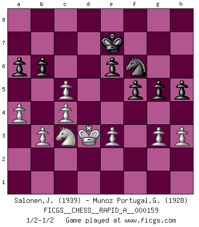 Last move : 1/2-1/2 2014 May 5 18:4:56 [Event "FICGS__CHESS__RAPID_A__000159"] [Site "FICGS"] [Date "2014.03.28"] [Round "1"] [White "Salonen,Jukka"] [Black "Munoz Portugal,Guillermo"] [Result "1/2-1/2"] [WhiteElo "1939"] [BlackElo "1928"] 1.d4 Nf6 2.c4 e6 3.Nf3 d5 4.Bg5 Be7 5.e3 h6 6.Bh4 O-O 7.Nc3 b6 8.Bd3 Bb7 9.O-O Nbd7 10.Qe2 c5 11.Rad1 Ne4 12.Bxe7 Qxe7 13.Bxe4 dxe4 14.Nd2 f5 15.f3 exf3 16.Nxf3 Rad8 17.Qe1 Bxf3 18.Rxf3 Nf6 19.h3 Qc7 20.b3 Rd7 21.Qh4 Rfd8 22.R3f1 a6 23.a4 Kh7 24.Rfe1 Qd6 25.Rd3 Qc7 26.R3d1 Kg8 27.Rf1 Qd6 28.Rd3 Qe7 29.Re1 Kf7 30.Rf1 Kf8 31.Qf4 Kg8 32.Qe5 Qd6 33.Qxd6 Rxd6 34.Rfd1 Kf7 35.Kf2 Ke7 36.Ke2 g5 37.g3 h5 38.dxc5 Rxd3 39.Rxd3 Rxd3 40.Kxd3 1/2-1/2 Queen's pawn game Kingside Castling by player Black (move 6) Kingside Castling by player White (move 9) This chess game ended in a draw. Follow this game move after move (download)A good sacrifice is one that is not necessarily sound but leaves your opponent dazed and confused. (Rudolph Spielmann) Ihnen, Herr Lasker, habe ich nur drei Worte zu sagen: Schach und matt. (Siegbert Tarrasch) Al jugar al Ajedrez entonces, podemos aprender: Primero: Previsión... Segundo: Prudencia... Tercero: Cautela... Y al final, aprendemos del Ajedrez el hábito de no ser desanimados por apariencias malas presentes en el estado de nuestros asuntos, el hábito de la esperanza por una oportunidad favorable y la perseveración de los secretos de los recursos. (Benjamin Franklin) Pour se monter efficace, un Cavalier a besoin d'avant-postes ! Les Cavaliers font les meilleurs bloqueurs de pions passés. When a man with money meets a man with experience, the man with experience leaves with money and the man with money leaves with experience. (Anonymous)