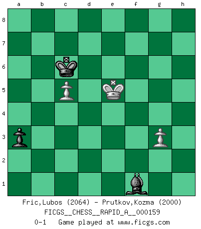 Last move : 0-1 2014 May 16 20:2:19 [Event "FICGS__CHESS__RAPID_A__000159"] [Site "FICGS"] [Date "2014.03.28"] [Round "1"] [White "Fric,Lubos"] [Black "Prutkov,Kozma"] [Result "0-1"] [WhiteElo "2064"] [BlackElo "2000"] 1.d4 Nf6 2.c4 e6 3.Nf3 b6 4.g3 Bb7 5.Bg2 Be7 6.O-O O-O 7.Nc3 Ne4 8.Qc2 Nxc3 9.Qxc3 c5 10.Rd1 d6 11.b3 Bf6 12.Bb2 Qe7 13.Qe3 Nc6 14.Rd2 Rad8 15.Rad1 Ba8 16.Qd3 e5 17.dxe5 dxe5 18.Qb1 Nd4 19.Ne1 e4 20.e3 Nf3+ 21.Bxf3 exf3 22.Bxf6 Qxf6 23.Qc2 Bb7 24.h4 h6 25.Nd3 g5 26.hxg5 hxg5 27.Ne1 Kg7 28.Rxd8 Rxd8 29.Rxd8 Qxd8 30.Qc3+ Qf6 31.Qxf6+ Kxf6 32.g4 Ke5 33.Nd3+ Ke4 34.Nb2 Bc8 35.Kf1 Bxg4 36.Ke1 Bd7 37.Kd2 g4 38.Nd1 Ke5 39.Nb2 Bc6 40.Nd3+ Kf5 41.Ke1 Be4 42.Nb2 Bb1 43.a3 Ba2 44.b4 cxb4 45.axb4 Ke4 46.Kd2 f6 47.c5 bxc5 48.bxc5 Kd5 49.Na4 Kc6 50.Nc3 Bd5 51.e4 Be6 52.Nb1 a5 53.Kc3 g3 54.fxg3 f2 55.Nd2 Bh3 56.Kd3 f1Q+ 57.Nxf1 Bxf1+ 58.Kd4 a4 59.e5 fxe5+ 60.Kxe5 a3 0-1 Queen's Indian : Old Main line, 7.Nc3 Kingside Castling by player White (move 6) Kingside Castling by player Black (move 6) 10 pieces endgame at move 54 : White KNPPP , Black KBPPP WHITE : King + 1 Knight 3 Pawns BLACK : King + 1 Bishop 3 Pawns Promotion Queen by player Black (move 56) 9 pieces endgame at move 57 : White KNPPP , Black KBPP WHITE : King + 1 Knight 3 Pawns BLACK : King + 1 Bishop 2 Pawns 8 pieces endgame at move 57 : White KPPP , Black KBPP WHITE : King + 3 Pawns BLACK : King + 1 Bishop 2 Pawns 7 pieces endgame at move 59 : White KPP , Black KBPP WHITE : King + 2 Pawns BLACK : King + 1 Bishop 2 Pawns 6 pieces endgame at move 60 : White KPP , Black KBP WHITE : King + 2 Pawns BLACK : King + 1 Bishop 1 Pawn Player Black won this chess game. Follow this game move after move (download)Kasparov : J'adoube , Ivanchuk : S'il vous plaît ! (Garry Kasparov & Vassily Ivanchuk, Linares 1997) Die jungen Leute sollen verstehen, dass sie noch etwas von mir lernen können – und müssen. (Viktor Kortschnoi) Estaba muy claro de que el punto vulnerable del Gran Maestro Americano (Bobby Fischer) radicaba en las posiciones de doble filo, colgantes, irracionales, donde el siempre falló en encontrar un triunfo aún en una posición de clara victoria. (Efim Geller) Ce qui est bien, c'est d'avoir tout un tas de pièces en prise : l'adversaire ne peut en prendre qu'une à la fois. Cité par Thierry Audin. Man is still the most extraordinary computer of all. (John F. Kennedy)