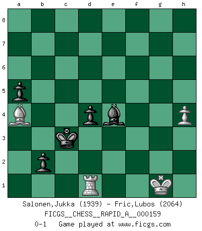 Last move : 0-1 2014 May 10 8:55:25 [Event "FICGS__CHESS__RAPID_A__000159"] [Site "FICGS"] [Date "2014.03.28"] [Round "1"] [White "Salonen,Jukka"] [Black "Fric,Lubos"] [Result "0-1"] [WhiteElo "1939"] [BlackElo "2064"] 1.d4 d5 2.c4 c6 3.e3 Nf6 4.Nc3 e6 5.Nf3 Nbd7 6.Bd3 dxc4 7.Bxc4 b5 8.Bd3 Bb7 9.O-O a6 10.e4 c5 11.d5 Qc7 12.dxe6 fxe6 13.Bc2 Bd6 14.Ng5 Nf8 15.f4 O-O-O 16.Qe1 e5 17.f5 h6 18.Nf3 g6 19.Nd2 Be7 20.a4 b4 21.Nd5 Nxd5 22.exd5 c4 23.f6 Bc5+ 24.Kh1 Bxd5 25.Be4 Bf7 26.Bf3 a5 27.Qe4 Ba7 28.Qa8+ Kd7 29.Qe4 Ke8 30.Qc2 Bd4 31.Ne4 Ne6 32.Bd2 Kf8 33.Rad1 Nf4 34.g3 Nd5 35.Bg2 g5 36.Rc1 Qd7 37.Bf3 Nb6 38.Ra1 Bd5 39.Be1 Qc6 40.Bf2 b3 41.Qe2 Rh7 42.Kg1 Nxa4 43.Rfe1 c3 44.Bxd4 exd4 45.Rxa4 Qxa4 46.Nxg5 hxg5 47.Qe7+ Rxe7 48.fxe7+ Ke8 49.Bh5+ Kd7 50.e8Q+ Rxe8 51.Bxe8+ Kd6 52.Bxa4 cxb2 53.Rb1 Kc5 54.Rxb2 Kb4 55.Rd2 Kc3 56.Rd1 b2 57.h4 gxh4 58.gxh4 Be4 0-1 QGD Slav defense Kingside Castling by player White (move 9) Queenside Castling by player Black (move 15) Promotion Queen by player White (move 50) 10 pieces endgame at move 57 : White KRBP , Black KBPPPP WHITE : King + 1 Rook 1 Bishop 1 Pawn BLACK : King + 1 Bishop 4 Pawns 9 pieces endgame at move 58 : White KRBP , Black KBPPP WHITE : King + 1 Rook 1 Bishop 1 Pawn BLACK : King + 1 Bishop 3 Pawns Player Black won this chess game. Follow this game move after move (download)I feel as if I were a piece in a game of Chess, when my opponent says of it: That piece cannot be moved. (Soren Kierkegaard) Je mehr ich von der FIDE weiss, um so weniger verstehe ich. (Alexander Kalifman) El Ajedrez expande y enriquece tu mente. (Saudin Robovic) À la honte des hommes, on sait que les lois du jeu sont les seules qui soient partout justes, claires, inviolables et exécutées. Pourquoi l'Indien qui a donné les règles du jeu d'échecs est-il obéi de bon gré dans toute la terre, et que les décrétales des papes, par exemple, sont aujourd'hui un objet d'horreur et de mépris ? C'est que l'inventeur des échecs combina tout avec justesse pour la satisfaction des joueurs, et que les papes, dans leurs décrétales, n'eurent en vue que leur seul avantage. L'Indien voulut exercer également l'esprit des hommes et leur donner du plaisir; les papes ont voulu abrutir l'esprit des hommes. Voltaire (Dictionnaire philosophique / Garnier 1967) Animated gif is worth one mega-word. (Unknown)