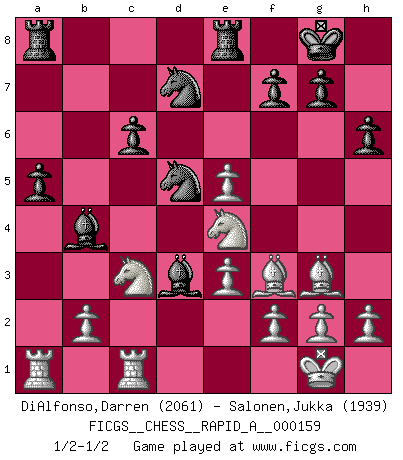 Last move : 1/2-1/2 2014 April 17 16:6:39 [Event "FICGS__CHESS__RAPID_A__000159"] [Site "FICGS"] [Date "2014.03.28"] [Round "1"] [White "DiAlfonso,Darren"] [Black "Salonen,Jukka"] [Result "1/2-1/2"] [WhiteElo "2061"] [BlackElo "1939"] 1.d4 d5 2.c4 e6 3.Nc3 Nf6 4.Bg5 Be7 5.e3 Nbd7 6.Nf3 O-O 7.Rc1 c6 8.Bd3 dxc4 9.Bxc4 h6 10.Bh4 b5 11.Bd3 a6 12.a4 bxa4 13.Nxa4 Qa5+ 14.Nd2 Bb4 15.Ra1 Re8 16.Nc3 Qh5 17.Qxh5 Nxh5 18.Be2 Nhf6 19.O-O a5 20.Rfc1 Nd5 21.Bf3 Ba6 22.Bg3 Bd3 23.Nde4 e5 24.dxe5 1/2-1/2 QGD : 4.Bg5 Be7 Kingside Castling by player Black (move 6) Kingside Castling by player White (move 19) This chess game ended in a draw. Follow this game move after move (download)Bobby Fischer is the greatest Chess genius of all time ! (Alexander Kotov) Schach ist ein schwarz-weisser Dschungel. (Garry Kasparov) Del Ajedrez se ha dicho que la vida no es lo suficientemente larga para él, pero eso es culpa de la vida, no del Ajedrez. (William Ewart Napier) Les sacrifices démontrent seulement que quelqu'un a gaffé. (Savielly Tartacover) How many people work in NATO Headquarters ? - About half of them. (Dirk Stikker, NATO general secretary)
