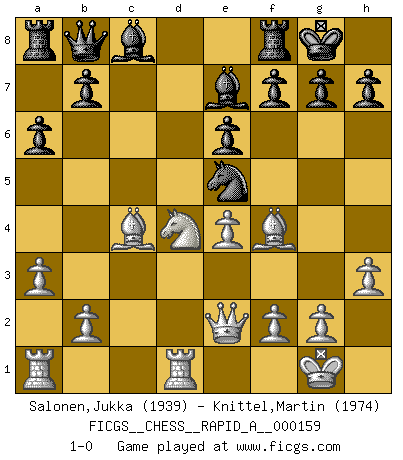 Last move : 1-0 2014 May 20 21:31:41 [Event "FICGS__CHESS__RAPID_A__000159"] [Site "FICGS"] [Date "2014.03.28"] [Round "1"] [White "Salonen,Jukka"] [Black "Knittel,Martin"] [Result "1-0"] [WhiteElo "1939"] [BlackElo "1974"] 1.d4 d5 2.c4 c6 3.e3 Nf6 4.Nc3 e6 5.Nf3 Be7 6.Bd3 dxc4 7.Bxc4 c5 8.O-O O-O 9.Qe2 Nc6 10.Rd1 Qc7 11.dxc5 Bxc5 12.a3 Be7 13.e4 Ng4 14.Nb5 Qb8 15.h3 Nge5 16.Bf4 a6 17.Nxe5 Nxe5 18.Nd4 1-0 This chess game has been lost on time (started : 2014.03.28 22:24:30) QGD Slav defense Kingside Castling by player White (move 8) Kingside Castling by player Black (move 8) Player White won this chess game. Follow this game move after move (download)A Chess game is a dialogue, a conversation between a player and his opponent. Each move by the opponent may contain threats or be a blunder, but a player cannot defend against threats or take advantage of blunders if he does not first ask himself: What is my opponent planning after each move ? (Bruce A. Moon) Ich bin der einzige Schachspieler, der sich während der Vorbereitungen zum Turnier verletzt hat. (Woody Allen) Sin errores no puede haber brillantez. (Emanuel Lasker) Vous savez, camarade Pachman, je n'éprouve pas de plaisir à être ministre, je jouerais plutôt aux échecs comme vous, ou alors ferais une révolution au Venezuela. (Che Guevara à Ludek Pachman, 'Checkmate in Prague', 1975) God, you are such an idiot. - Actually, I thought I was more of a jerk. (Gregory House to Stacy Warner, House M.D.)