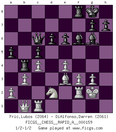 Last move : 1/2-1/2 2014 April 23 17:17:14 [Event "FICGS__CHESS__RAPID_A__000159"] [Site "FICGS"] [Date "2014.03.28"] [Round "1"] [White "Fric,Lubos"] [Black "DiAlfonso,Darren"] [Result "1/2-1/2"] [WhiteElo "2064"] [BlackElo "2061"] 1.d4 Nf6 2.c4 e6 3.Nf3 b6 4.g3 Ba6 5.Qb3 Nc6 6.Nbd2 Na5 7.Qa4 Bb7 8.Bg2 c5 9.dxc5 bxc5 10.O-O Be7 11.Rd1 O-O 12.Nb3 Nxb3 13.Qxb3 Rb8 14.Qa3 Qb6 15.Bd2 Bc6 16.b3 d6 17.Rac1 Ne4 18.Bf4 Qb7 19.Be3 f5 20.Nd2 Nxg3 21.hxg3 Bxg2 22.f3 Bh3 23.Kh2 f4 24.Bxf4 Bf5 25.e4 Bg6 26.Qa5 Qc6 27.Rf1 Bf6 28.Be3 Rb4 29.Rcd1 Bh5 30.Rf2 a6 31.Kg2 Bd8 32.Qa3 a5 33.Qb2 Bf6 34.Qb1 Bg6 35.Rc1 1/2-1/2 Queen's Indian : Nimzovich variation (exaggerated Fianchetto) Kingside Castling by player White (move 10) Kingside Castling by player Black (move 11) This chess game ended in a draw. Follow this game move after move (download)Chess opens and enriches your mind. (Saudin Robovic) Ich weiss nicht was Gott gegen mich auf 1.e4 antworten würde. (Robert James Fischer) El Ajedrez es despiadado: debes de estar preparado para matar gente. (Nigel Short) Il n'y a plus de joueurs du niveau de Jacob Murray dont la seule quête est le beau jeu, le plaisir de voir les pièces construire quelque chose. Sur 10 idées à la minute, 9 seront sans intérêt, la dernière s'avèrera géniale. (Christian Bauer) Always be a first-rate version of yourself, instead of a second-rate version of somebody else. (Judy Garland)