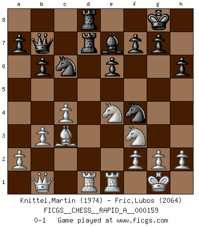 Last move : 0-1 2014 May 28 10:6:6 [Event "FICGS__CHESS__RAPID_A__000159"] [Site "FICGS"] [Date "2014.03.28"] [Round "1"] [White "Knittel,Martin"] [Black "Fric,Lubos"] [Result "0-1"] [WhiteElo "1974"] [BlackElo "2064"] 1.Nf3 c5 2.e4 d6 3.Bb5+ Bd7 4.Bxd7+ Qxd7 5.O-O e6 6.d4 cxd4 7.Qxd4 Nc6 8.Qc4 Nge7 9.Qb3 Ng6 10.Bg5 h6 11.Be3 Be7 12.Nbd2 b6 13.Rad1 O-O 14.Rfe1 Na5 15.Qd3 Rfd8 16.b3 d5 17.exd5 Qb7 18.Bd4 Rxd5 19.c4 Rd7 20.Qb1 Rad8 21.Bc3 Nc6 22.Ne4 Nf4 0-1 This chess game has been lost on time (started : 2014.03.28 22:24:30) Reti Opening Kingside Castling by player White (move 5) Kingside Castling by player Black (move 13) Player Black won this chess game. Follow this game move after move (download)When you don't know what to do, wait for your opponent to get an idea - it's sure to be wrong. (Tarrasch) Auf jeden Fall musst du zuerst Rechtsanwalt werden, damit du deine eigenen Interessen und die deiner Familie vertreten kannst. [Brief an seinen Sohn] (José Raúl Capablanca) Yo no le temo a Spassky. Todos saben que yo soy el mejor. Uno no necesita un torneo para probarlo. (Bobby Fischer) Karpov est une pièce de musée. (Garry Kasparov) The only thing that overcomes hard luck is hard work. (Harry Golden)