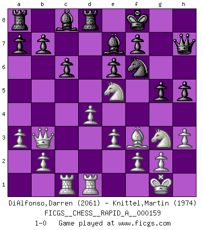 Last move : 1-0 2014 May 31 22:12:13 [Event "FICGS__CHESS__RAPID_A__000159"] [Site "FICGS"] [Date "2014.03.28"] [Round "1"] [White "DiAlfonso,Darren"] [Black "Knittel,Martin"] [Result "1-0"] [WhiteElo "2061"] [BlackElo "1974"] 1.d4 d5 2.c4 c6 3.Nf3 Nf6 4.Nc3 e6 5.Bg5 h6 6.Bxf6 Qxf6 7.e3 Nd7 8.Bd3 Qd8 9.O-O Be7 10.Qc2 O-O 11.a3 dxc4 12.Bxc4 Qc7 13.Ba2 Rd8 14.Rac1 Qa5 15.Rfd1 Qf5 16.Qd2 Qh7 17.Bb1 g6 18.Ne4 Qg7 19.Qc3 Nb6 20.Qb3 Nd5 21.Bd3 g5 22.Ng3 Nf6 23.Ne5 h5 24.h3 Kf8 25.Be2 Qh7 26.Bf3 1-0 This chess game has been lost on time (started : 2014.03.28 22:24:30) QGD Slav : 4.Nc3 Kingside Castling by player White (move 9) Kingside Castling by player Black (move 10) Player White won this chess game. Follow this game move after move (download)Morphy was probably the greatest genius of them all. (Bobby Fischer) Mit sehr nachdenklichem Gesicht schreitet Bobby durch den Turniersaal. Was ist passiert?, fragt Lombardy. Ich stehe schlecht, antwortet Fischer. Lombardy: Dann biete doch einfach Remis an. Fischer: So schlecht stehe ich nun auch wieder nicht! (Robert James Fischer) Tu sabes que vas a perder. Aún cuando tenía la ventaja, yo sabía que iba a perder. - al estar jugando con Fischer (Andrew Soltis) Je menace de comprendre la position. (Anonyme) Over-the-board chess is the favorite of mortals, correspondence chess is the favorite of the gods. (Eduard Dyckhoff)
