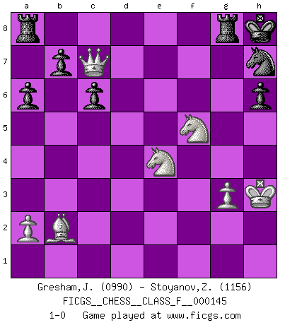 Last move : 1-0 2014 May 6 20:47:56 [Event "FICGS__CHESS__CLASS_F__000145"] [Site "FICGS"] [Date "2014.03.29"] [Round "1"] [White "Gresham,Jonathan"] [Black "Stoyanov,Zdravko"] [Result "1-0"] [WhiteElo "0990"] [BlackElo "1156"] 1.e4 e5 2.d4 exd4 3.c3 dxc3 4.Bc4 h6 5.Nf3 cxb2 6.Bxb2 d6 7.h3 a6 8.Nc3 Nf6 9.O-O Nc6 10.Qb3 Qe7 11.Rfe1 Be6 12.Bd5 Na5 13.Qa4+ c6 14.Bxe6 fxe6 15.Qxa5 d5 16.exd5 Nxd5 17.Nd4 Nf4 18.Re4 Qd6 19.g3 Nxh3+ 20.Kh2 Nxf2 21.Rxe6+ Be7 22.Rxd6 Bxd6 23.Re1+ Be7 24.Qc7 O-O 25.Rxe7 Ng4+ 26.Kh3 Nf6 27.Rxg7+ Kh8 28.Nf5 Rg8 29.Rh7+ Nxh7 30.Ne4 1-0 Danish gambit Kingside Castling by player White (move 9) Kingside Castling by player Black (move 24) Player White won this chess game. Follow this game move after move (download)A passed Pawn increases in strength as the number of pieces on the board diminishes. (Capablanca) Ich bin stolz ein Bulgare zu sein. (Veselin Topalov) Cuando la partida de Ajedrez termina, el Peón y el Rey regresan a la misma caja. (Irish saying) Aucun coup ne doit être joué sans but. (Pedro Damiano) The beginning is the most important part of the work. (Plato)