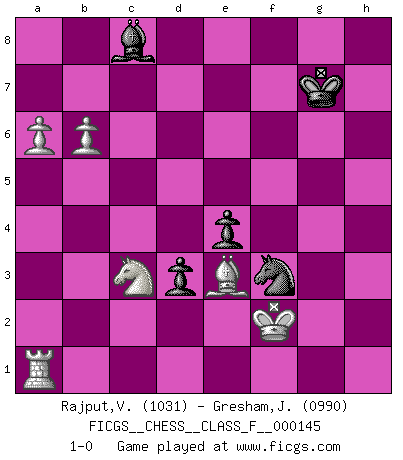 Last move : 1-0 2014 May 14 21:42:59 [Event "FICGS__CHESS__CLASS_F__000145"] [Site "FICGS"] [Date "2014.03.29"] [Round "1"] [White "Rajput,Vishalsingh"] [Black "Gresham,Jonathan"] [Result "1-0"] [WhiteElo "1031"] [BlackElo "0990"] 1.e4 c5 2.Nf3 Nc6 3.Bc4 g6 4.O-O Bg7 5.Nc3 e5 6.h3 Nge7 7.a4 Nd4 8.d3 O-O 9.Be3 Kh8 10.Nh2 f5 11.Bg5 Bf6 12.Bd2 f4 13.Rb1 d6 14.Nd5 Bh4 15.c3 Ng8 16.Ng4 h5 17.Nh2 g5 18.Qxh5+ Kg7 19.cxd4 cxd4 20.g3 fxg3 21.fxg3 Bxg3 22.Rxf8 Qxf8 23.Qxg5+ Kh8 24.Qxg3 Be6 25.Rf1 Qg7 26.Qxg7+ Kxg7 27.Nc7 Bxc4 28.Nxa8 Bxd3 29.Re1 Nf6 30.Bg5 Nxe4 31.Nf3 Nc5 32.Ra1 b5 33.a5 Be4 34.Nxd4 Bxa8 35.Nxb5 Ne4 36.Be7 d5 37.Nxa7 d4 38.Nb5 d3 39.Nc3 Nd2 40.Kf2 e4 41.Bg5 Nf3 42.Be3 Bc6 43.b4 Bd7 44.b5 Bxh3 45.b6 Bc8 46.a6 1-0 Sicilian defense Kingside Castling by player White (move 4) Kingside Castling by player Black (move 8) Player White won this chess game. Follow this game move after move (download)I won't play with you anymore. You have insulted my friend. - When an opponent cursed himself for a blunder. (Miguel Najdorf) Warum muß ich gegen diesen IDIOTEN verlieren? (Aaron Nimzowitsch) La vida es como el Ajedrez, con lucha, competición y eventos buenos y malos. (Benjamin Franklin) Echiquier : carré parfait, comme la Jérusalem nouvelle décrite par l'auteur de l'Apocalypse, huit cases sur huit, exaltation du chiffre 4, symbole du cosmos aux quatre horizons... où le noir et le blanc, l'ombre et la lumière, le mal et le bien s'entremêlent et se conjuguent. (Robert Couffignal, Le Gambit du poète) He who laughs last probably does not get the joke. (Unknown)