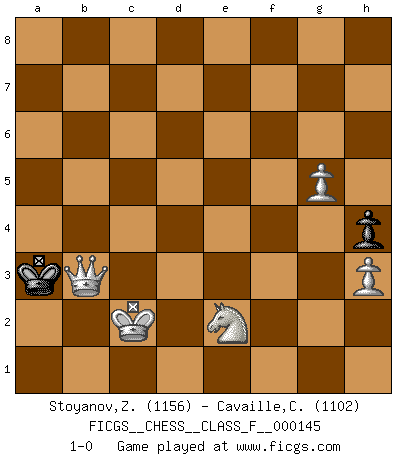 Last move : 1-0 2014 April 23 18:19:21 [Event "FICGS__CHESS__CLASS_F__000145"] [Site "FICGS"] [Date "2014.03.29"] [Round "1"] [White "Stoyanov,Zdravko"] [Black "Cavaille,Cedric"] [Result "1-0"] [WhiteElo "1156"] [BlackElo "1102"] 1.e4 e5 2.Nf3 d6 3.h3 Nf6 4.c3 Nxe4 5.Qa4+ Nc6 6.Qxe4 Bd7 7.d4 Qe7 8.Nbd2 exd4 9.Qxe7+ Bxe7 10.Bc4 dxc3 11.bxc3 O-O 12.O-O Bg5 13.Nxg5 Ne5 14.Bb3 h6 15.Nge4 b5 16.Bb2 a5 17.c4 bxc4 18.Bxc4 Rab8 19.Bxe5 dxe5 20.Nc5 Rfd8 21.Nde4 Bf5 22.Ng3 Rb4 23.Bxf7+ Kxf7 24.Nxf5 Rd2 25.Nb3 Rd5 26.Rfc1 a4 27.Nc5 a3 28.Nb3 Kf6 29.Ne3 Rd7 30.Rxc7 Rxc7 31.Nd5+ Kf5 32.Nxb4 e4 33.g4+ Ke5 34.Kg2 Rc4 35.Na6 Kf4 36.Nb8 Rc2 37.Nd4 Rd2 38.Ne6+ Ke5 39.Nxg7 e3 40.Nc6+ Ke4 41.Nb4 e2 42.Re1 Kd4 43.Nf5+ Kc4 44.Nc6 Rxa2 45.Ng3 Kc5 46.Ne5 Kb4 47.Nxe2 Rb2 48.Nd3+ Kb3 49.Nxb2 Kxb2 50.f4 a2 51.f5 a1Q 52.Rxa1 Kxa1 53.f6 h5 54.g5 Kb2 55.f7 Kc2 56.f8Q Kd2 57.Kf2 Kd3 58.Qf5+ Kc4 59.Ke3 Kb4 60.Kd3 Kb3 61.Qb5+ Ka3 62.Kc2 h4 63.Qb3+ 1-0 Philidor's defense Kingside Castling by player Black (move 11) Kingside Castling by player White (move 12) 10 pieces endgame at move 49 : White KRNNPPP , Black KPP WHITE : King + 1 Rook 2 Knights 3 Pawns BLACK : King + 2 Pawns 9 pieces endgame at move 49 : White KRNPPP , Black KPP WHITE : King + 1 Rook 1 Knight 3 Pawns BLACK : King + 2 Pawns Promotion Queen by player Black (move 51) 8 pieces endgame at move 52 : White KRNPPP , Black KP WHITE : King + 1 Rook 1 Knight 3 Pawns BLACK : King + 1 Pawn 7 pieces endgame at move 52 : White KNPPP , Black KP WHITE : King + 1 Knight 3 Pawns BLACK : King + 1 Pawn Promotion Queen by player White (move 56) Player White won this chess game. Follow this game move after move (download)Fischer wanted to give the Russians a taste of their own medicine. (Larry Evans) Wenn du gegen Bobby spielst, ist es keine Frage von gewinnen oder verlieren. Es ist eine Frage des Überlebens. (Boris Vassilievich Spassky) Existen dos clases de sacrificios: los correctos y los míos. (Mikhail Tal) Pour se monter efficace, un Cavalier a besoin d'avant-postes ! Les Cavaliers font les meilleurs bloqueurs de pions passés. It's unlucky to be superstitious. (Dave Enteles)