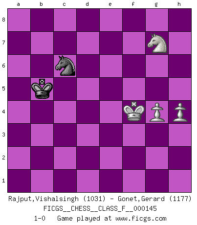 Last move : 1-0 2014 April 10 15:25:51 [Event "FICGS__CHESS__CLASS_F__000145"] [Site "FICGS"] [Date "2014.03.29"] [Round "1"] [White "Rajput,Vishalsingh"] [Black "Gonet,Gerard"] [Result "1-0"] [WhiteElo "1031"] [BlackElo "1177"] 1.e4 e5 2.Nf3 Nf6 3.Nc3 Bb4 4.Qe2 O-O 5.a3 Ba5 6.b4 Bb6 7.Qc4 c6 8.Bd3 d5 9.exd5 cxd5 10.Qb5 Bd7 11.Bxh7+ Kxh7 12.Qe2 Nc6 13.Nb5 Re8 14.O-O Qb8 15.c4 dxc4 16.Qxc4 Be6 17.Ng5+ Kh8 18.Nxf7+ Bxf7 19.Qxf7 a6 20.Nc3 Qd6 21.Re1 Re7 22.Qg6 Bd4 23.Rb1 Qe6 24.Ne4 Qg4 25.Qxg4 Nxg4 26.h3 Rf8 27.Re2 Nh6 28.d3 Ref7 29.Be3 Bxe3 30.Rxe3 Nf5 31.R3e1 Nfd4 32.a4 a5 33.bxa5 Nxa5 34.Nd6 Rxf2 35.Rxe5 Nac6 36.Re8 Ne2+ 37.Kh1 Ncd4 38.Rxf8+ Rxf8 39.Rxb7 Ng3+ 40.Kh2 Nde2 41.Ne4 Nf1+ 42.Kh1 Rd8 43.Rb1 Ne3 44.Re1 Rxd3 45.Rxe2 Nc4 46.Ng5 Rd1+ 47.Kh2 Nd6 48.Ra2 Rd5 49.Ne6 Nb7 50.Rb2 Na5 51.Rb5 Rxb5 52.axb5 Kg8 53.Nc7 Kf8 54.h4 Ke7 55.g4 Kd7 56.Na6 Kc8 57.Nc5 Kc7 58.Ne6+ Kb6 59.Nxg7 Kxb5 60.Kg3 Nc6 61.Kf4 1-0 Petrov Three knights game Kingside Castling by player Black (move 4) Kingside Castling by player White (move 14) 10 pieces endgame at move 45 : White KRNPPP , Black KRNP WHITE : King + 1 Rook 1 Knight 3 Pawns BLACK : King + 1 Rook 1 Knight 1 Pawn 9 pieces endgame at move 51 : White KNPPP , Black KRNP WHITE : King + 1 Knight 3 Pawns BLACK : King + 1 Rook 1 Knight 1 Pawn 8 pieces endgame at move 52 : White KNPPP , Black KNP WHITE : King + 1 Knight 3 Pawns BLACK : King + 1 Knight 1 Pawn 7 pieces endgame at move 59 : White KNPPP , Black KN WHITE : King + 1 Knight 3 Pawns BLACK : King + 1 Knight 6 pieces endgame at move 59 : White KNPP , Black KN WHITE : King + 1 Knight 2 Pawns BLACK : King + 1 Knight Player White won this chess game. Follow this game move after move (download)My style is somewhere between that of Tal and Petrosian. (Reshevsky) Schach ist die gewalttätigste aller Sportarten. (Garry Kasparov) La vida es como el Ajedrez, con lucha, competición y eventos buenos y malos. (Benjamin Franklin) La victoire dans une partie d'Echecs appartient la plupart du temps à celui qui voit un peu plus loin que l'adversaire. (Lasker) I feel so... helpless. (C-3PO in Star Wars ep.3)