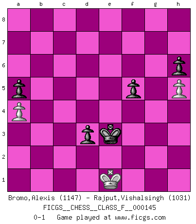 Last move : 0-1 2014 April 9 19:58:18 [Event "FICGS__CHESS__CLASS_F__000145"] [Site "FICGS"] [Date "2014.03.29"] [Round "1"] [White "Bromo,Alexis"] [Black "Rajput,Vishalsingh"] [Result "0-1"] [WhiteElo "1147"] [BlackElo "1031"] 1.d4 d5 2.c4 Bf5 3.Nc3 e6 4.a3 Nf6 5.Nf3 Be7 6.h3 h6 7.Bf4 O-O 8.e3 Ne4 9.Bd3 Nxc3 10.bxc3 Bxd3 11.Qxd3 dxc4 12.Qxc4 Bd6 13.Ne5 Nd7 14.O-O Nb6 15.Qb3 a5 16.c4 Nd7 17.Nxd7 Qxd7 18.Qxb7 Bxf4 19.exf4 Qxd4 20.Qxc7 Rfc8 21.Qe5 Rxc4 22.Qxd4 Rxd4 23.g3 Kf8 24.Rfd1 Rad8 25.Rxd4 Rxd4 26.Rb1 Ke7 27.Kf1 Ra4 28.Rb3 Kf6 29.Ke2 Rc4 30.Kd3 Rc1 31.Rb5 Rd1+ 32.Ke2 Rd5 33.Rxd5 exd5 34.Kd3 Ke6 35.Kd4 Kd6 36.g4 Kc6 37.a4 Kd6 38.f3 Kc6 39.h4 g6 40.f5 gxf5 41.h5 f6 42.gxf5 Kd6 43.f4 Kc6 44.Kd3 Kc5 45.Kc3 d4+ 46.Kd3 Kd5 47.Kd2 Kc4 48.Kc2 d3+ 49.Kd2 Kd4 50.Kd1 Ke3 51.Ke1 Kxf4 52.Kd2 Ke4 53.Kd1 Kxf5 54.Kd2 Ke4 55.Kd1 Ke3 56.Ke1 f5 0-1 QGD : Grau (Sahovic) defense Kingside Castling by player Black (move 7) Kingside Castling by player White (move 14) 10 pieces endgame at move 42 : White KPPPP , Black KPPPP WHITE : King + 4 Pawns BLACK : King + 4 Pawns 9 pieces endgame at move 51 : White KPPP , Black KPPPP WHITE : King + 3 Pawns BLACK : King + 4 Pawns 8 pieces endgame at move 53 : White KPP , Black KPPPP WHITE : King + 2 Pawns BLACK : King + 4 Pawns Player Black won this chess game. Follow this game move after move (download)I'd rather have a Pawn than a finger. (Reuben Fine) Das Schach ist nichts für kleine Geister, es beansprucht einen vollen Mann, der sich nicht sklavisch an das Überlieferte hält, sondern selbständig die Tiefen des Spiels zu ergründen sucht. (Wilhelm Steinitz) Yo siempre he tenido un ligero sentimiento de lástima por una persona que no tiene conocimiento del Ajedrez. (Siegbert Tarrasch) Le jeu d'échecs fait naître et fortifie en nous plusieurs qualités précieuses dans le cours de l'existence, telles que la prévoyance, la circonspection, la prudence, et la persévérance. (Benjamin Franklin - 1783, la morale des échecs) All battles are fought by scared men who'd rather be someplace else. (John Wayne in the movie In harm's way)