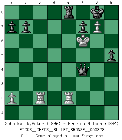 Last move : 0-1 2014 April 1 12:30:32 [Event "FICGS__CHESS__BULLET_BRONZE__000828"] [Site "FICGS"] [Date "2014.04.01"] [Round "1"] [White "Schalkwijk,Peter"] [Black "Pereira,Nilson"] [Result "0-1"] [WhiteElo "1896"] [BlackElo "1884"] 1.d4 Nf6 2.Nf3 d5 3.e3 e6 4.Bd3 c5 5.c3 Nc6 6.Nbd2 Bd6 7.O-O O-O 8.Qe2 Qc7 9.h3 c4 10.Bc2 e5 11.dxe5 Nxe5 12.Nxe5 Bxe5 13.f4 Bd6 14.g4 Re8 15.Qf3 h5 16.g5 Rxe3 17.Qxe3 Bc5 18.Qd4 Bxd4+ 19.cxd4 c3 20.gxf6 cxd2 21.Bxd2 Qxc2 22.Rf2 Qxb2 23.Re1 Bxh3 24.fxg7 Qxd4 25.Be3 Qc3 26.R1e2 d4 27.Bxd4 Qxd4 28.Kh2 Bg4 29.Rc2 Re8 30.Kg3 Qd3+ 31.Kh4 Qh3+ 32.Kg5 Be2 33.Rfxe2 Qg4+ 34.Kf6 Qxf4+ 0-1 Queen's pawn game Kingside Castling by player White (move 7) Kingside Castling by player Black (move 7) Player Black won this chess game. Follow this game move after move (download)Before the endgame, the Gods have placed the middle game. (Siegbert Tarrasch) Die jungen Leute sollen verstehen, dass sie noch etwas von mir lernen können und müssen. (Viktor Kortschnoi) El jugador de combinación piensa hacia adelante; comienza de la posición dada y trabaja las movidas contundentes en su mente. (Emanuel Lasker) Vous n'êtes pas toujours obligé de jouer le meilleur coup. Un coup doit être actif, entreprenant, correct et beau ! (David Bronstein) Now the reason the enlightened prince and the wise general conquer the enemy whenever they move and their achievements surpass those of ordinary men is foreknowledge. (Sun Tzu)
