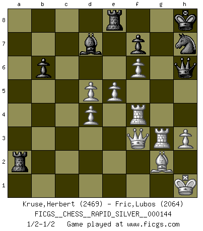 Last move : 1/2-1/2 2014 June 16 15:52:32 [Event "FICGS__CHESS__RAPID_SILVER__000144"] [Site "FICGS"] [Date "2014.04.02"] [Round "2"] [White "Kruse,Herbert"] [Black "Fric,Lubos"] [Result "1/2-1/2"] [WhiteElo "2469"] [BlackElo "2064"] 1.Nf3 c5 2.g3 g6 3.Bg2 Bg7 4.O-O Nc6 5.c4 d6 6.Nc3 Bd7 7.Rb1 Rb8 8.a3 Bxc3 9.bxc3 h6 10.e4 Nf6 11.d3 b6 12.Nh4 Rc8 13.Qe2 e5 14.f4 Qe7 15.fxe5 Nxe5 16.a4 Be6 17.Ra1 Kf8 18.a5 Kg7 19.axb6 axb6 20.h3 Qd7 21.Kh2 Nh7 22.Rf2 Ng5 23.Qf1 Qc7 24.Bf4 Rhe8 25.g4 Rh8 26.Qe2 Rhe8 27.Raf1 Nh7 28.Nf5+ gxf5 29.gxf5 Bd7 30.f6+ Kh8 31.Bxh6 Ng6 32.Kh1 d5 33.cxd5 Qg3 34.Rf3 Qh4 35.Qe3 Ra8 36.Rg3 Re5 37.Bf4 Nxf4 38.Rxf4 Qh6 39.d4 cxd4 40.cxd4 R5e8 41.e5 Ra3 42.Qf2 Ra2 43.Qf3 1/2-1/2 Reti Opening Kingside Castling by player White (move 4) This chess game ended in a draw. Follow this game move after move (download)Help your pieces so they can help you. (Paul Morphy) Fischer ist das größte Genie, das je vom Schachhimmel heruntergestiegen ist. (Mikhail Nekhemyevich Tal) Para mi, el Ajedrez es la vida y cada partida es como una nueva vida. Todo jugador de Ajedrez suele vivir muchas vidas durante su vida. (Eduard Gufeld) Les écrivains ont utilisé les échecs pour analyser les côtés extrêmes de la nature humaine. Dans ce cadre, les échecs offrent un champ d'expérimentation idéal. Mais on pourrait faire la même chose avec la peinture. Et là, en vous référant à Van Gogh, vous ne tirerez pas de conclusion définitive sur les peintres. (Gary Kasparov) Winning isn't everything... but losing is nothing. (Mednis)