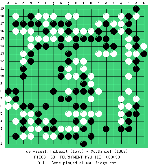 Last move : 0-1 2014 September 16 13:25:46 [Event "FICGS__GO__TOURNAMENT_KYU_III__000030"] [Site "FICGS"] [Date "2014.04.02"] [Round "1"] [Black "de Vassal,Thibault"] [White "Xu,Daniel"] [Result "0-1"] [Rating 1 "1575"] [Rating 2 "1862"] 1.c3 q16 2.r3 d16 3.k4 r10 4.c10 q4 5.r4 q5 6.r5 q6 7.r7 q7 8.o3 n5 9.k6 h3 10.f3 k3 11.l3 l2 12.k2 j3 13.m2 l4 14.l1 k5 15.m4 l5 16.l6 m5 17.f6 k16 18.r17 q17 19.r16 r15 20.s15 r14 21.s14 r13 22.n15 n13 23.l15 l16 24.k14 m16 25.m15 l12 26.h14 h16 27.j12 j11 28.k11 k12 29.j13 k10 30.h11 j10 31.h10 j8 32.g8 c12 33.d12 c13 34.d13 d14 35.e14 d15 36.c11 r6 37.s6 s7 38.s5 r8 39.j7 j5 40.h7 m7 41.n16 q18 42.r18 n17 43.l8 m9 44.m8 n8 45.l9 m10 46.l10 l11 47.k8 e15 48.f14 g15 49.o14 o13 50.p14 p13 51.o17 o16 52.p16 o18 53.o15 p17 54.c17 c16 55.d17 b16 56.b17 e18 57.d18 b18 58.s12 s13 59.t13 r12 60.s11 f4 61.g4 f2 62.g3 g2 63.j2 e3 64.e4 d4 65.e5 d3 66.c4 c2 67.b2 d5 68.h2 d2 69.d6 c5 70.c6 b4 71.f16 f15 72.e17 f18 73.g17 g18 74.h17 j18 75.j17 k18 76.j16 j15 77.h15 g16 78.k15 f17 79.q3 b6 80.b7 a7 81.a8 a6 82.b8 s18 83.s19 t14 0-1 Here are the names of the openings (joseki) played in the four corners : Corner q4 : r3 q4 San-San (Sam-Sam, San-San) 3-3 Point. The San-San (3-3) point, emphasizing territory at the expense of influence. Kata-tsuki (shoulder hit). The shoulder-hit is the traditional answer to the 3-3. The direction of Black 3 depends on the positions on the side. Crawling once may be the premise for a follow-up move of sliding with a knight's move in the opposite direction. If Black plays 3 at 3-4 (to the right), the follow-on knight's move is then played at the top (e.g. 3-4, 4-5, 5-2). Black's knight's move reduces territory potential on the side it is played. Corner d4 : c3 h3 San-San (Sam-Sam, San-San) 3-3 Point. The San-San (3-3) point, emphasizing territory at the expense of influence. Corner q16 : q16 r17 Hoshi (Hwajeom, Seongjeom, Xingwei`) 4-4 Point. The star or hoshi (4-4) point, emphasizing influence at the potential expense of territory. Corner d16 : d16 h14 Hoshi (Hwajeom, Seongjeom, Xingwei`) 4-4 Point. The star or hoshi (4-4) point, emphasizing influence at the potential expense of territory. Player White won this Go (weiqi, baduk) game. Follow this game move after move (download)Beginner's games are surprising, often incoherent and incomprehensible. When you improve, your game gains in consistency but flirts with stupidity: you become satisfied with truisms and mechanical movements, you try to obtain a feeling for clearness and style the easy way. (Pierre Audouard) Bobby never cared about money, though. His only desire was to prove that his choices were correct: He wanted chess to be important because he was a chess player, and he wanted to be important. Bobby knew money was important, but he didn't have a clue why, outside of clothes and status. The only way he could accomplish what he wanted was to fight for a lot of money. Once he got it, he gave it away. He did not know how to spend it. And once he'd become champion, after, essentially, sacrificing his life for it, he didn't know how to spend his time. (Bob Wade)