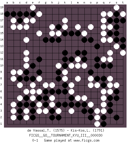 Last move : 0-1 2014 September 20 14:26:44 [Event "FICGS__GO__TOURNAMENT_KYU_III__000030"] [Site "FICGS"] [Date "2014.04.02"] [Round "1"] [Black "de Vassal,Thibault"] [White "Kis-Kos,Laszlo"] [Result "0-1"] [Rating 1 "1575"] [Rating 2 "1791"] 1.c3 q16 2.r3 d16 3.k4 d6 4.d5 c5 5.d4 c7 6.f5 d10 7.r10 q4 8.r4 q5 9.r5 q6 10.o3 r6 11.s6 s7 12.s5 r8 13.p10 q3 14.q2 p2 15.q1 p1 16.s2 p3 17.o2 q11 18.q10 o4 19.n4 n5 20.n3 m5 21.m4 n10 22.p11 r11 23.p13 r14 24.o14 o16 25.n11 m11 26.n12 m10 27.m12 k17 28.k12 d14 29.o9 m8 30.m15 m16 31.l5 e17 32.l15 h5 33.g4 h4 34.h3 j3 35.j4 g3 36.h2 f3 37.j2 f4 38.g5 e5 39.e4 e6 40.h6 d2 41.e2 d3 42.e3 b3 43.c2 b2 44.c4 b4 45.j16 k16 46.k15 j15 47.j14 h15 48.h14 h16 49.g14 d12 50.f11 n15 51.n14 l6 52.k6 l3 53.l4 l7 54.k10 o8 55.p8 o7 56.q7 p7 57.q8 r7 58.k7 k8 59.j8 k9 60.j9 l10 61.l11 j10 62.k11 f15 63.f9 g7 64.r17 q17 65.s16 q18 66.s18 r18 67.r15 q14 68.s14 r16 69.s17 s13 70.t13 t12 71.t14 r12 72.c17 c16 73.d18 b17 74.b18 d17 75.c18 b16 76.e18 f18 77.d9 c9 78.e10 d11 79.g6 s19 80.s15 q15 81.t19 t18 82.t17 h7 83.f7 f6 84.j6 f8 85.e8 e7 86.c8 b8 87.d8 b9 88.a18 e19 0-1 Here are the names of the openings (joseki) played in the four corners : Corner d4 : c3 d6 San-San (Sam-Sam, San-San) 3-3 Point. The San-San (3-3) point, emphasizing territory at the expense of influence. Niken Takagakari (Dukan Nop'dakeolch'im, E`r Gaogua`jiao~, 2-Space High Approach). Black may continue with 4-5 or 4-6. Black 4-6 works well when Black is in the lower right (so an extension in the middle works both ways). The more conservative 4-5 is makes a slightly tighter shape (better for a fight). Corner q4 : r3 q4 San-San (Sam-Sam, San-San) 3-3 Point. The San-San (3-3) point, emphasizing territory at the expense of influence. Kata-tsuki (shoulder hit). The shoulder-hit is the traditional answer to the 3-3. The direction of Black 3 depends on the positions on the side. Crawling once may be the premise for a follow-up move of sliding with a knight's move in the opposite direction. If Black plays 3 at 3-4 (to the right), the follow-on knight's move is then played at the top (e.g. 3-4, 4-5, 5-2). Black's knight's move reduces territory potential on the side it is played. Player White won this Go (weiqi, baduk) game. Follow this game move after move (download)Eyes win semiais. (Anonymous) It is not true that people stop pursuing dreams because they grow old, they grow old because they stop pursuing dreams. (Gabriel Garcia Marquez)