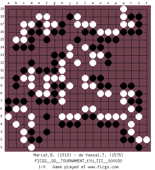 Last move : 1-0 2014 November 1 21:56:47 [Event "FICGS__GO__TOURNAMENT_KYU_III__000030 "] [Site "FICGS"] [Date "2014.04.02"] [Round "1"] [Black "Mariat,Benoit "] [White "de Vassal,Thibault "] [Result "1-0"] [Rating 1 "1913"] [Rating 2 "1575"] 1.q16 c3 2.q3 c17 3.r9 d10 4.k4 k17 5.k15 n16 6.n15 o16 7.o15 p16 8.p15 q17 9.r16 r17 10.s16 q5 11.o4 r3 12.r2 s2 13.q2 r4 14.s6 q7 15.r7 r6 16.s7 q8 17.q9 r8 18.s8 o8 19.o9 n8 20.n9 o5 21.n4 n5 22.f3 d5 23.f5 k12 24.d16 c16 25.d15 c15 26.d14 m12 27.o12 h12 28.h16 m9 29.c14 d17 30.e17 e18 31.b10 h5 32.h4 j5 33.j4 k5 34.l5 l6 35.m5 m6 36.f7 h7 37.m10 l9 38.c7 b6 39.b7 c6 40.s17 f8 41.e7 e8 42.f11 g10 43.g11 h11 44.g13 f17 45.e16 l10 46.d2 c2 47.m16 m17 48.l16 l17 49.c11 f16 50.f15 d11 51.d12 s5 52.g16 g17 53.r18 q18 54.s18 q19 55.b14 b15 56.d3 d4 57.h17 f18 58.s1 t2 59.d8 f10 60.h13 j13 61.e11 d9 62.j18 k18 63.p4 p5 64.g8 f9 65.g7 h8 66.n10 d1 67.e2 n13 68.o13 c10 69.b9 j14 70.g12 l14 71.h9 j9 72.g9 h10 73.a6 a5 74.a7 b4 75.m14 m13 76.n14 1-0 Here are the names of the openings (joseki) played in the four corners : Corner q16 : q16 n16Hoshi (Hwajeom, Seongjeom, Xingwei`) 4-4 Point. The star or hoshi (4-4) point, emphasizing influence at the potential expense of territory.Niken Takagakari (Dukan Nop'dakeolch'im, E`r Gaojia, 2-Space High Approach). White 2 is a light approach move. Rarely played in even games, White 2 is typically employed in handicap games. Black continues with 6-4 or 3-10. In Korean Sunjang Baduk Black has a stone on 8-4. Corner d4 : c3 f3San-San (Sam-Sam, San-San) 3-3 Point. The San-San (3-3) point, emphasizing territory at the expense of influence.Niken Kakari (Dukan Keolch'im, E`r Gua`jiao~, 2-Space Low Approach). White can thwart Black's strategy with a play at 9-4. Corner d16 : c17 d16San-San (Sam-Sam, San-San) 3-3 Point. The San-San (3-3) point, emphasizing territory at the expense of influence.Kata-tsuki (shoulder hit). The shoulder-hit is the traditional answer to the 3-3. The direction of White 3 depends on the positions on the side. Crawling once may be the premise for a follow-up move of sliding with a knight's move in the opposite direction. If White plays 3 at 3-4 (to the right), the follow-on knight's move is then played at the top (e.g. 3-4, 4-5, 5-2). White's knight's move reduces territory potential on the side it is played. Player Black won this Go (weiqi, baduk) game.Follow this game move after move (download ) Use a wall to attack, not to make territory. (Anonymous) An expert is a man who has made all the mistakes which can be made in a very narrow field. (Niels Bohr)