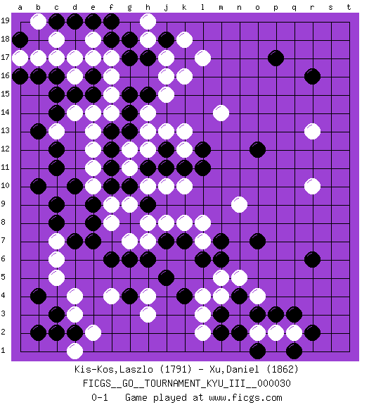 Last move : 0-1 2014 May 1 18:38:6 [Event "FICGS__GO__TOURNAMENT_KYU_III__000030"] [Site "FICGS"] [Date "2014.04.02"] [Round "1"] [Black "Kis-Kos,Laszlo"] [White "Xu,Daniel"] [Result "0-1"] [Rating 1 "1791"] [Rating 2 "1862"] 1.r16 d16 2.q3 d4 3.p17 r10 4.r6 r13 5.k4 h3 6.c14 f17 7.b16 c17 8.c11 m4 9.j5 f4 10.m6 q2 11.p3 p2 12.o3 o2 13.r2 n3 14.m2 l3 15.n2 l2 16.q1 o4 17.o1 m5 18.m3 l4 19.n4 n5 20.c8 c6 21.c3 d3 22.b4 c5 23.d2 e2 24.b2 d1 25.c2 d9 26.c9 d8 27.h17 b17 28.d7 c7 29.e7 c10 30.d10 f8 31.f6 e10 32.b10 g7 33.g6 h7 34.g4 h4 35.j7 j8 36.k7 k8 37.m7 l8 38.h6 l7 39.l6 e11 40.h9 g9 41.h11 k10 42.g10 h8 43.o7 h13 44.j12 j13 45.l12 k12 46.k11 k13 47.l11 j10 48.j11 m14 49.o12 n9 50.f12 g12 51.f11 g11 52.f10 h10 53.e9 f9 54.e8 e12 55.f13 e13 56.g13 h12 57.g15 d14 58.c15 c13 59.b13 k16 60.k17 j16 61.g17 f16 62.h15 j17 63.j18 k18 64.g18 l17 65.d15 f14 66.g14 f15 67.e15 e14 68.e16 e17 69.f18 e18 70.c16 d17 71.f19 h19 72.e19 c18 73.d19 h18 74.c12 j15 75.c19 b19 76.a18 a17 77.a16 h14 0-1 Here are the names of the openings (joseki) played in the four corners : Corner d16 : d16 c14 Hoshi (Hwajeom, Seongjeom, Xingwei`) 4-4 Point. The star or hoshi (4-4) point, emphasizing influence at the potential expense of territory. Ikken Kakari (Hankan Keolch'im, Yi Gua`jiao~, 1-Space Low Approach). Black 2 is the standard approach move to the 4-4. Player White won this Go (weiqi, baduk) game. Follow this game move after move (download)The saki bottle shape is negative. (Anonymous) Treat your password like your toothbrush. Don't let anybody else use it, and get a new one every six months. (Clifford Stoll)