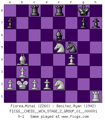 Last move : 0-1 2007 June 10 15:30:59 [Event "FICGS__CHESS__WCH_STAGE_2_GROUP_01__000001"] [Site "FICGS"] [Date "2007.02.15"] [Round "1"] [White "Florea,Mihai"] [Black "Benitez,Ryan"] [Result "0-1"] [WhiteElo "2260"] [BlackElo "1942"] 1.e4 e5 2.Nf3 Nc6 3.Bc4 Nf6 4.Ng5 d5 5.exd5 Na5 6.Bb5+ c6 7.dxc6 bxc6 8.Qf3 Be7 9.Bxc6+ Nxc6 10.Qxc6+ Bd7 11.Qf3 O-O 12.Nc3 Ng4 13.Nge4 f5 14.Ng3 e4 15.Qe2 Bd6 16.h3 Ne5 17.b3 Bc6 18.Bb2 f4 19.Ngxe4 f3 20.gxf3 Nxf3+ 21.Kd1 Rc8 22.Kc1 Be5 23.Nc5 Qe7 24.Nd3 Nd4 25.Qe3 Bxh1 26.Nxe5 Nf5 27.Qe1 Bg2 28.Ne2 Rfe8 29.f4 Qb7 30.Bc3 Bxh3 31.Kb2 Nd6 32.Qh1 Qxh1 33.Rxh1 Be6 34.Bb4 Nf5 0-1 Two knights defense Kingside Castling by player Black (move 11) Player Black won this chess game. Follow this game move after move (download)It is the aim of the modern school, not to treat every position according to one general law, but according to the principle inherent in the position. (Richard Reti) Wer sich die Fähigkeit anerziehen will im Schach selbstständig zu denken, der muß alles meiden, was leblos ist: ausgeklügelte Theorien, die sich auf sehr wenige Beispiele und eine Menge Hirngespinste stützen. (Emanuel Lasker) A través de las casillas del tablero, los Indios explican el movimiento del tiempo y la edad, las influencias mas altas que controlan el mundo y los lazos que vinculan al Ajedrez con el alma humana. (Al-Masudi) L'ordinateur a tué l'originalité. Il n'y a plus guère d'aventures sur l'échiquier. (Jacob Murray) The right perception of any matter and a misunderstanding of the same matter do not wholly exclude each other. (Kafka's the trial)