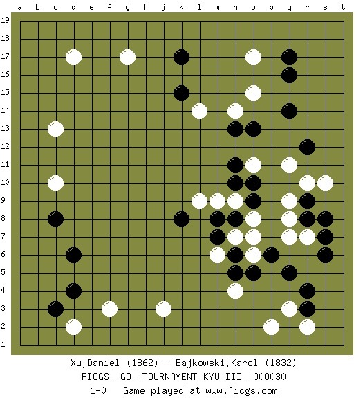 Last move : 1-0 2014 May 10 20:2:52 [Event "FICGS__GO__TOURNAMENT_KYU_III__000030"] [Site "FICGS"] [Date "2014.04.02"] [Round "1"] [Black "Xu,Daniel"] [White "Bajkowski,Karol"] [Result "1-0"] [Rating 1 "1862"] [Rating 2 "1832"] 1.q16 d17 2.d4 q3 3.q5 r7 4.r3 r2 5.r4 p2 6.p6 r10 7.r12 n4 8.r9 q9 9.r8 q8 10.s7 q7 11.s6 s10 12.s8 q11 13.q14 f3 14.d6 d2 15.c3 j3 16.n6 c10 17.c8 c13 18.k17 g17 19.k15 o17 20.q17 o15 21.o13 n14 22.n13 l14 23.o10 o8 24.n8 o11 25.n11 n9 26.n10 n7 27.m8 o7 28.m7 m9 29.o9 o6 30.o5 m6 31.n5 l9 32.k8 1-0 Here are the names of the openings (joseki) played in the four corners : Corner q4 : q3 q5 Komoku (Somok, Xiao~mu`) 3-4 Point. The komoku (3-4) point is the traditional corner enclosure move.. Ikken Takagakari (Hankan Nop'dakeolch'im, Yi Gaogua`jiao~, 1-Space High Approach). The 5-4 approach move has become more popular in modern times, as modern Go emphasizes speed and influence. Corner d4 : d4 f3 Hoshi (Hwajeom, Seongjeom, Xingwei`) 4-4 Point. The star or hoshi (4-4) point, emphasizing influence at the potential expense of territory. Ikken Kakari (Hankan Keolch'im, Yi Gua`jiao~, 1-Space Low Approach). White 2 is the standard approach move to the 4-4. Player Black won this Go (weiqi, baduk) game. Follow this game move after move (download)Those who are good at winning, don't usually fight. (Zhang) A good teacher is like a candle - it consumes itself to light the way for others. (Author unknown)