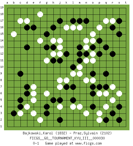 Last move : 0-1 2014 June 30 9:4:48 [Event "FICGS__GO__TOURNAMENT_KYU_III__000030 "] [Site "FICGS"] [Date "2014.04.02"] [Round "1"] [Black "Bajkowski,Karol "] [White "Praz,Sylvain "] [Result "0-1"] [Rating 1 "1832"] [Rating 2 "2102"] 1.c4 q4 2.r16 c17 3.d16 d17 4.e16 b15 5.d13 f18 6.h16 e3 7.g4 e5 8.d6 j4 9.g3 e6 10.d7 g6 11.h5 e7 12.c9 j7 13.j2 f2 14.j5 l4 15.l5 m4 16.k7 k8 17.l7 j8 18.o6 p3 19.r6 q6 20.q7 p6 21.p7 r7 22.r3 r5 23.q2 p2 24.s4 s6 25.s2 p16 26.n17 r17 27.s17 q17 28.s15 o15 29.r12 f14 30.g15 m16 31.m17 l16 32.l17 k16 33.j17 c3 34.b3 d4 35.c5 j14 36.o13 o11 37.n12 p13 38.p12 o12 39.p14 o14 40.q13 n13 41.m13 p13 42.h13 h14 43.o13 n14 44.m11 m10 45.l10 m9 46.k12 n11 47.m12 l9 48.o9 o8 49.o7 n8 50.o4 n3 51.q9 h12 52.g13 j13 53.h11 j12 54.j11 g11 0-1 Here are the names of the openings (joseki) played in the four corners : Corner d16 : c17 d16San-San (Sam-Sam, San-San) 3-3 Point. The San-San (3-3) point, emphasizing territory at the expense of influence.Kata-tsuki (shoulder hit). The shoulder-hit is the traditional answer to the 3-3. The direction of White 3 depends on the positions on the side. Crawling once may be the premise for a follow-up move of sliding with a knight's move in the opposite direction. If White plays 3 at 3-4 (to the right), the follow-on knight's move is then played at the top (e.g. 3-4, 4-5, 5-2). White's knight's move reduces territory potential on the side it is played. Corner d4 : c4 e3Komoku (Somok, Xiao~mu`) 3-4 Point. The komoku (3-4) point is the traditional corner enclosure move..Ikken Kakari (Hankan Keolch'im, Yi Gua`jiao~, 1-Space Low Pincer). The small knight move is the basic approach move to the 3-4 point stone. It has been continually used for over four centuries. There are limitless variations, with new moves constantly being discovered. White 2 opens the door to a treaure store of joseki. Corner q16 : r16 p16Komoku (Somok, Xiao~mu`) 3-4 Point. The komoku (3-4) point is the traditional corner enclosure move..Ikken Takagakari (Hankan Nop'dakeolch'im, Yi Gaogua`jiao~, 1-Space High Approach). The 5-4 approach move has become more popular in modern times, as modern Go emphasizes speed and influence. Player White won this Go (weiqi, baduk) game.Follow this game move after move (download ) Six eyes in a rectangle are alive. (Anonymous) Nowadays, anyone who cannot speak English and is incapable of using the Internet is regarded as backward. (Al-Waleed bin Talal)