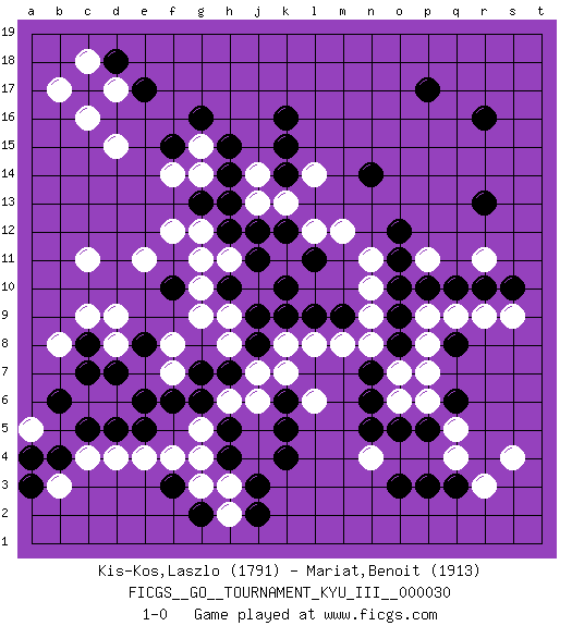 Last move : 1-0 2014 June 19 21:14:49 [Event "FICGS__GO__TOURNAMENT_KYU_III__000030"] [Site "FICGS"] [Date "2014.04.02"] [Round "1"] [Black "Kis-Kos,Laszlo"] [White "Mariat,Benoit"] [Result "1-0"] [Rating 1 "1791"] [Rating 2 "1913"] 1.r16 d4 2.q3 d17 3.p17 q5 4.q8 n4 5.p5 p6 6.o5 q4 7.o3 r3 8.p3 o6 9.n5 s4 10.f3 d6 11.k4 c11 12.g16 d15 13.k16 r11 14.r13 p11 15.n6 p8 16.c8 e11 17.c5 c6 18.d5 e4 19.e5 f4 20.e6 d8 21.b6 c9 22.d7 g3 23.g2 h3 24.j3 h2 25.j2 c4 26.b4 b3 27.c17 c16 28.d18 c18 29.e17 b17 30.e8 d9 31.o8 p9 32.h5 g5 33.g6 h6 34.h4 g4 35.g7 j6 36.k5 h8 37.h7 j7 38.j8 k8 39.j9 h9 40.k9 l8 41.h10 g9 42.f10 g10 43.l9 m8 44.m9 o7 45.n7 n8 46.o9 n9 47.o10 n10 48.o11 n11 49.o12 l6 50.p10 q9 51.q6 p7 52.q10 r9 53.r10 s9 54.k12 m12 55.s10 l14 56.k14 l12 57.k6 k7 58.n14 k11 59.j11 h11 60.l11 k13 61.j12 j13 62.h12 j10 63.k10 g12 64.h13 j14 65.g13 f12 66.k15 g15 67.h10 g11 68.f15 f14 69.h15 g14 70.h14 b8 71.c7 f7 72.f6 f8 73.a3 a5 74.a4 1-0 Here are the names of the openings (joseki) played in the four corners : Corner q4 : q3 q5 Komoku (Somok, Xiao~mu`) 3-4 Point. The komoku (3-4) point is the traditional corner enclosure move.. Ikken Takagakari (Hankan Nop'dakeolch'im, Yi Gaogua`jiao~, 1-Space High Approach). The 5-4 approach move has become more popular in modern times, as modern Go emphasizes speed and influence. Corner d4 : d4 f3 Hoshi (Hwajeom, Seongjeom, Xingwei`) 4-4 Point. The star or hoshi (4-4) point, emphasizing influence at the potential expense of territory. Ikken Kakari (Hankan Keolch'im, Yi Gua`jiao~, 1-Space Low Approach). Black 2 is the standard approach move to the 4-4. Player Black won this Go (weiqi, baduk) game. Follow this game move after move (download)Proverbs do not apply to White. (Tero Sand) It's not the size of the dog in the fight, it's the size of the fight in the dog. (Mark Twain)