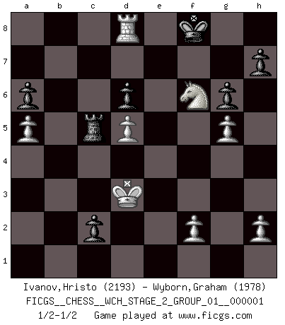 Last move : 1/2-1/2 2007 May 13 22:16:50 [Event "FICGS__CHESS__WCH_STAGE_2_GROUP_01__000001"] [Site "FICGS"] [Date "2007.02.15"] [Round "1"] [White "Ivanov,Hristo"] [Black "Wyborn,Graham"] [Result "1/2-1/2"] [WhiteElo "2193"] [BlackElo "1978"] 1.e4 c5 2.Nf3 Nc6 3.Bb5 g6 4.O-O Bg7 5.c3 Nf6 6.d4 cxd4 7.cxd4 Nxe4 8.d5 Nd6 9.Na3 a6 10.Bd3 Nb4 11.Nc4 Nxd3 12.Nxd6+ exd6 13.Qxd3 O-O 14.a4 b5 15.Bg5 Qb6 16.Be3 Qb7 17.a5 Bxb2 18.Bh6 Qc7 19.Bxf8 Bxa1 20.Rxa1 Kxf8 21.Ng5 Kg8 22.Ne4 Qc4 23.Qxc4 bxc4 24.Rb1 Ra7 25.g4 Rc7 26.g5 f6 27.Nxf6+ Kf7 28.Kf1 Bb7 29.Ke2 c3 30.Kd3 Rc5 31.Rxb7 c2 32.Rxd7+ Kf8 33.Rd8+ 1/2-1/2 Sicilian : Nimzovich-Rossolimo attack (with ...g6, without ...d6) Kingside Castling by player White (move 4) Kingside Castling by player Black (move 13) This chess game ended in a draw. Follow this game move after move (download)Kasparov : J'adoube , Ivanchuk : S'il vous plaît ! (Garry Kasparov & Vassily Ivanchuk, Linares 1997) Die Jungen erwarten, dass Opa einfach umfällt. Dann aber kann Opa fünf Stunden lang Schach spielen und die jungen Gegner an die Wand drücken. (Viktor Kortschnoi) Existen dos clases de sacrificios: los correctos y los mÃos. (Mikhail Tal) Le temps de noter son nom sur la feuille de partie, j'étais déjà en zeitnot ! D'un modeste amateur apparié lors de la première ronde d'un open contre le grand-maître Azmaïparashvili. I don't diet. I just don't eat as much as I'd like to. (Linda Evangelista, supermodel)