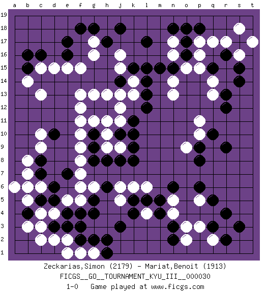 Last move : 1-0 2014 August 14 21:43:20 [Event "FICGS__GO__TOURNAMENT_KYU_III__000030"] [Site "FICGS"] [Date "2014.04.02"] [Round "1"] [Black "Zeckarias,Simon"] [White "Mariat,Benoit"] [Result "1-0"] [Rating 1 "2179"] [Rating 2 "1913"] 1.r16 d4 2.q3 p16 3.e17 q14 4.r9 d15 5.c16 c15 6.b16 f15 7.e16 e15 8.b15 c13 9.j3 j5 10.f3 f5 11.c8 c10 12.b4 c6 13.b6 b7 14.c7 b5 15.c5 a6 16.d6 b6 17.d5 b8 18.e7 c4 19.e4 b3 20.d3 c3 21.l17 r17 22.s17 q17 23.s14 s18 24.r13 q13 25.r12 g17 26.o17 n17 27.n18 n16 28.p18 s16 29.q5 l4 30.k5 j6 31.k4 k6 32.l5 l6 33.m5 r3 34.r4 q2 35.r2 p3 36.s3 o2 37.n3 p5 38.p6 n4 39.m4 n5 40.n6 o3 41.n2 e5 42.d10 c9 43.g5 g6 44.k11 h9 45.g4 f7 46.h11 f11 47.g10 f10 48.g9 f9 49.g8 f8 50.j14 j16 51.l15 p11 52.q10 p10 53.p9 o9 54.p8 k14 55.k15 j15 56.l13 j13 57.l14 k13 58.l12 d2 59.f4 f6 60.g12 f13 61.f18 g1 62.g2 f1 63.h1 e2 64.f2 e1 65.h2 b14 66.e3 c2 67.o16 n14 68.n15 o15 69.m15 p17 70.o18 n13 71.s15 t17 72.q15 p15 73.g18 h13 74.j18 j11 75.j10 j12 76.k10 h10 77.h8 j9 78.k8 g11 79.h12 g13 80.j8 f12 81.h17 g16 82.k9 h11 83.h6 1-0 Here are the names of the openings (joseki) played in the four corners : Corner q16 : r16 p16 Komoku (Somok, Xiao~mu`) 3-4 Point. The komoku (3-4) point is the traditional corner enclosure move.. Ikken Takagakari (Hankan Nop'dakeolch'im, Yi Gaogua`jiao~, 1-Space High Approach). The 5-4 approach move has become more popular in modern times, as modern Go emphasizes speed and influence. Corner d16 : e17 d15 Mokuhazushi (Waemok, Wai`mu`) 5-3 Point. The mokuhazushi (5-3) point was popular in the Edo period in Japan (1600 - 1867). It emphasizes influence; territorially, it is inferior to the 3-4 point. Takamoku Kakari. White prevents Black from gaining influence, but in the local context, abandoning profit in the corner entails a loss. Black 3-4 and 4-4 are best. Corner d4 : d4 j3 Hoshi (Hwajeom, Seongjeom, Xingwei`) 4-4 Point. The star or hoshi (4-4) point, emphasizing influence at the potential expense of territory. Player Black won this Go (weiqi, baduk) game. Follow this game move after move (download)A meijin needs no joseki. (Anonymous) The Movers & Shakers of this world are those who play chess in the mornings and go to the disco in the evenings. (Dinesh De Silva)