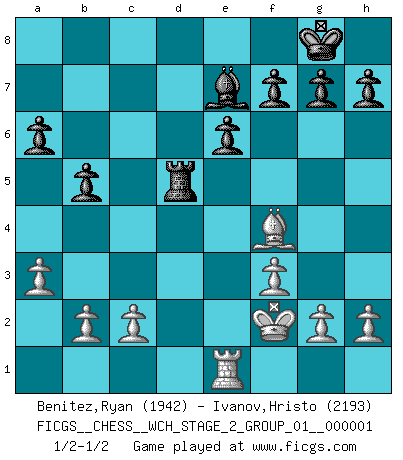 Last move : 1/2-1/2 2007 May 13 16:13:46 [Event "FICGS__CHESS__WCH_STAGE_2_GROUP_01__000001"] [Site "FICGS"] [Date "2007.02.15"] [Round "1"] [White "Benitez,Ryan"] [Black "Ivanov,Hristo"] [Result "1/2-1/2"] [WhiteElo "1942"] [BlackElo "2193"] 1.e4 c5 2.Nf3 Nc6 3.Nc3 d6 4.Bc4 Nf6 5.O-O e6 6.d4 cxd4 7.Nxd4 Be7 8.Be3 O-O 9.Re1 Bd7 10.Qe2 a6 11.a3 Rc8 12.Nxc6 Bxc6 13.Bf4 b5 14.Bb3 Qc7 15.Rad1 Rfe8 16.Qd3 Rcd8 17.f3 Qb7 18.Qe3 d5 19.exd5 Bxd5 20.Nxd5 Nxd5 21.Bxd5 Rxd5 22.Rxd5 Qxd5 23.Qe4 Rd8 24.Qxd5 Rxd5 25.Kf2 1/2-1/2 Sicilian defense Kingside Castling by player White (move 5) Kingside Castling by player Black (move 8) This chess game ended in a draw. Follow this game move after move (download)If you aren't afraid of Spassky, then I have removed the element of money. (Jim Slater) Wenn Du einsam bist, wenn Du Dich in der Welt wie ein Fremder fühlst, spiele Schach. Das wird Deinen Geist erheben und Dein Ratgeber im Kampf sein. (Aristoteles) Bobby solo arroja las piezas y solas caen en las casillas correctas. (Miguel Najdorf ) C'est la seule position que je connaisse où les deux camps sont mals. Propos prêtés à V. Anand. The obstacle is the path. (Zen proverb)