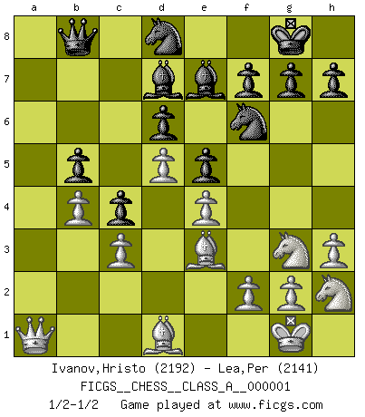 Last move : 1/2-1/2 2006 June 1 10:1:2 [Event "FICGS__CHESS__CLASS_A__000001"] [Site "FICGS"] [Date "2006.04.08"] [Round "1"] [White "Ivanov,Hristo"] [Black "Lea,Per"] [Result "1/2-1/2"] [WhiteElo "2192"] [BlackElo "2141"] 1.e4 e5 2.Nf3 Nc6 3.Bb5 a6 4.Ba4 Nf6 5.O-O Be7 6.Re1 b5 7.Bb3 O-O 8.h3 d6 9.c3 Na5 10.Bc2 c5 11.d4 Qc7 12.Nbd2 Nc6 13.d5 Nd8 14.a4 Rb8 15.axb5 axb5 16.b4 Nb7 17.Nf1 Bd7 18.Be3 Ra8 19.Qd2 Rfc8 20.Bd3 c4 21.Bc2 Ne8 22.Reb1 Nd8 23.Qd1 Qb7 24.Ng3 Rxa1 25.Rxa1 Ra8 26.Qb1 Rxa1 27.Qxa1 Qb8 28.Nh2 Nf6 29.Bd1 1/2-1/2 Ruy Lopez : Closed, 7...O-O Kingside Castling by player White (move 5) Kingside Castling by player Black (move 7) This chess game ended in a draw. Follow this game move after move (download)On the chessboard, lies and hypocrisy do not survive long. (Emanuel Lasker) Der Verteidiger gebe der Gewalt nach, aber nur der Gewalt. Er schaffe sich nicht freiwillig, etwa aus Blindheit oder aus Schrecken, irgendwelche Schwächen. Er lasse sich nicht bluffen. (Emanuel Lasker) El juego del Ajedrez no es solamente una diversión quieta; algunas cualidades muy valuables de la mente se pueden adquirir y cultivar con el, como convertirlos en habitos disponibles para toda ocasión; ya que la vida es algo así como el Ajedrez. (Benjamin Franklin) Pour moi, les échecs ne sont pas un jeu mais un art. (Alexandre Alekhine) Art is the only way to run away without leaving home. (Twyla Tharp)