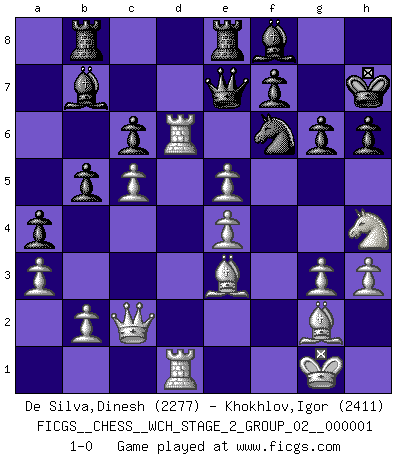 Last move : 1-0 2007 May 23 18:41:12 [Event "FICGS__CHESS__WCH_STAGE_2_GROUP_02__000001"] [Site "FICGS"] [Date "2007.02.15"] [Round "1"] [White "De Silva,Dinesh"] [Black "Khokhlov,Igor"] [Result "1-0"] [WhiteElo "2277"] [BlackElo "2411"] 1.Nf3 Nf6 2.c4 g6 3.Nc3 Bg7 4.d4 O-O 5.e4 d6 6.Be2 Nbd7 7.O-O c6 8.Re1 e5 9.Bf1 a5 10.dxe5 dxe5 11.Na4 Qe7 12.Qc2 b6 13.Be3 Rb8 14.h3 Ba6 15.a3 b5 16.c5 Bb7 17.Nb6 a4 18.Nxd7 Nxd7 19.Rad1 Nf6 20.Rd6 h6 21.Red1 Rfe8 22.g3 Bf8 23.Bg2 Rec8 24.Nh4 Kh7 25.f4 Re8 26.fxe5 1-0 Reti Opening Kingside Castling by player Black (move 4) Kingside Castling by player White (move 7) Player White won this chess game. Follow this game move after move (download)It is no time to be playing Chess when the house is on fire. (Italian Proverb) Moralische Siege zählen nicht. (Savielly Grigorievitsch Tartakower) Solo el jugador con la iniciativa tiene el derecho a atacar. (Wilhelm Steinitz) Les Echecs, c'est l'art de la guerre sans les charniers, c'est la résurrection des morts tombés au champ d'honneur, l'espoir perpétuel, la suprématie de l'intelligence sur la force, la culture de l'esprit. (F. Szpiner) You can't play chess if you're groggy from pills. (Anatoly Karpov)