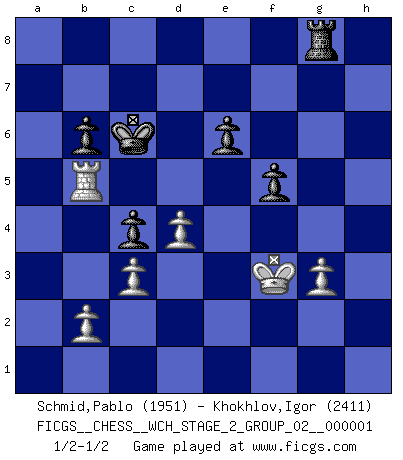 Last move : 1/2-1/2 2007 July 13 13:16:22 [Event "FICGS__CHESS__WCH_STAGE_2_GROUP_02__000001"] [Site "FICGS"] [Date "2007.02.15"] [Round "1"] [White "Schmid,Pablo"] [Black "Khokhlov,Igor"] [Result "1/2-1/2"] [WhiteElo "1951"] [BlackElo "2411"] 1.d4 Nf6 2.f3 d5 3.e4 dxe4 4.Nc3 exf3 5.Nxf3 g6 6.Bc4 Bg7 7.O-O O-O 8.Qe1 Bg4 9.Qh4 Nc6 10.Ne2 Bf5 11.c3 Na5 12.Bb5 c6 13.Ba4 b5 14.Bd1 Nd5 15.Ng3 Bd3 16.Be2 Bxe2 17.Nxe2 Nc4 18.Ng5 h6 19.Nf3 Nd6 20.Ne5 g5 21.Qh5 f5 22.h4 Qe8 23.Qxe8 Rfxe8 24.hxg5 hxg5 25.Bxg5 Rac8 26.Nd3 e6 27.Bf4 Ne4 28.a4 Re7 29.Be5 Bxe5 30.Nxe5 Ne3 31.Rf3 Nc4 32.axb5 cxb5 33.Nxc4 bxc4 34.Ng3 Nxg3 35.Rxg3+ Kf7 36.Re3 Kf6 37.Ra6 Rb8 38.Re2 Rb6 39.Rxb6 axb6 40.Re5 Rb7 41.Rb5 Ke7 42.Kf2 Kd6 43.Ke3 Kc6 44.Re5 Kd6 45.Kf4 Rg7 46.g3 Rg4+ 47.Kf3 Rg8 48.Rb5 Kc6 1/2-1/2 Blackmar-Diemer gambit Kingside Castling by player White (move 7) Kingside Castling by player Black (move 7) This chess game ended in a draw. Follow this game move after move (download)There are two types of sacrifices: correct ones and mine. (Mikhail Tal) Wie gewinnt Tal? Er entwickelt alle seine Figuren in die Brettmitte und opfert sie dann irgendwo. (Robert James Fischer) No es suficiente ser un buen jugador, se debe también de jugar bién. (Siegbert Tarrasch) On croit qu'il y a plus de mauvais joueurs que de bons joueurs, c'est faux : Il y a autant de joueurs qui gagnent que de joueurs qui perdent. (Philippe Geluck) There is no instance of a country having benefited from prolonged warfare. (Sun Tzu)