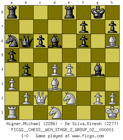 Last move : 1-0 2007 April 20 9:37:14 [Event "FICGS__CHESS__WCH_STAGE_2_GROUP_02__000001"] [Site "FICGS"] [Date "2007.02.15"] [Round "1"] [White "Aigner,Michael"] [Black "De Silva,Dinesh"] [Result "1-0"] [WhiteElo "2286"] [BlackElo "2277"] 1.d4 Nf6 2.c4 e6 3.Nc3 Bb4 4.e3 O-O 5.Bd3 d5 6.cxd5 exd5 7.Nge2 Re8 8.Bd2 Bf8 9.Qc2 c6 10.O-O a5 11.Rad1 Na6 12.a3 b5 13.Ra1 Bd6 14.f3 Bd7 15.e4 b4 16.Nd1 Qb6 17.Kh1 dxe4 18.fxe4 Bg4 19.Rxf6 gxf6 20.Bh6 1-0 Nimzo-Indian : 4.e3 O-O, 5.Bd3 d5 Kingside Castling by player Black (move 4) Kingside Castling by player White (move 10) Player White won this chess game. Follow this game move after move (download)A passed Pawn increases in strength as the number of pieces on the board diminishes. (Capablanca) Obwohl ich vom Stil her kaum zu den Priestern der Schachkunst gezählt werde, halte ich Schach doch für eine Kunst. (Tigran Petrosjan) El poder defensivo de una pieza clavada, solamente es imaginario. (Aaron Nimzovich) L'action d'une oeuvre littéraire se déroule sur un champ de bataille. Les masques et les types du drame moderne correspondent aux pièces du jeu d'échecs. L'intrigue correspond aux coups et aux gambits, c'est à dire aux techniques du jeu telles qu'utilisées et interprétées par les joueurs. Les tactiques et les péripéties [mouvements] correspondent aux coups exécutés par l'adversaire. (Viktor Shklovsky) When you stop learning you start dying. (M. Scott Adams)