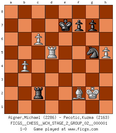 Last move : 1-0 2007 May 12 22:40:34 [Event "FICGS__CHESS__WCH_STAGE_2_GROUP_02__000001"] [Site "FICGS"] [Date "2007.02.15"] [Round "1"] [White "Aigner,Michael"] [Black "Pecotic,Kuzma"] [Result "1-0"] [WhiteElo "2286"] [BlackElo "2163"] 1.d4 Nf6 2.c4 e6 3.Nc3 Bb4 4.e3 O-O 5.Bd3 d5 6.cxd5 exd5 7.Nge2 Re8 8.Bd2 b6 9.Rc1 c6 10.O-O Bd6 11.Nf4 Ba6 12.Bxa6 Nxa6 13.Qa4 Nb8 14.Nce2 Ne4 15.Bb4 Bc7 16.Qc2 a5 17.Be1 Qg5 18.h4 Qf5 19.f3 Nd6 20.Bf2 Qxc2 21.Rxc2 Bd8 22.g4 a4 23.Nd3 Nc4 24.Nc3 Nd7 25.e4 dxe4 26.Nxe4 b5 27.Nb4 Rc8 28.b3 Be7 29.bxc4 Bxb4 30.Rb1 Bf8 31.cxb5 cxb5 32.Nc5 Bxc5 33.dxc5 Ne5 34.Rc3 Red8 35.Rxb5 h5 36.Rb4 Rd2 37.Rxa4 Rb8 38.Rb3 Rxb3 39.axb3 Nxf3+ 40.Kg2 Nxh4+ 41.Kf1 Nf3 42.gxh5 Rb2 43.Bg3 Rc2 44.b4 Nd4 45.Bf2 Rc1+ 46.Kg2 Rc2 47.Ra6 Kf8 48.Rd6 Ne6 49.c6 Ng5 50.Rd8+ Ke7 51.Rd5 1-0 Nimzo-Indian : 4.e3 O-O, 5.Bd3 d5 Kingside Castling by player Black (move 4) Kingside Castling by player White (move 10) Player White won this chess game. Follow this game move after move (download)Of all my Russian books, the defense contains and diffuses the greatest 'warmth' which may seem odd seeing how supremely abstract Chess is supposed to be. (Vladimir Nabokov) Der Traum, für den ich lebe, ist der von einem freien Russland. Viele mögen sagen: Russland hat doch ein Parlament, einen gewählten Präsidenten. Aber ich spüre, dass in meiner Heimat die Angst wiederkehrt. Eine Angst, sich frei zu äußern, bestimmte Dinge zu tun (Garry Kasparov) El jugador táctico sabe que hacer cuando hay algo que hacer; mientras que el estratega sabe que hacer cuando no hay nada que hacer. (Gerald Abrahams) Les erreurs sont comme les malheurs, elles n'arrivent jamais seules. (Siegbert Tarrasch) When you don't know what to do, walk fast and look worried. (Anonymous)
