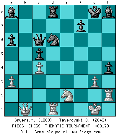 Last move : 0-1 2014 May 24 8:37:26 [Event "FICGS__CHESS__THEMATIC_TOURNAMENT__000179"] [Site "FICGS"] [Date "2014.04.05"] [Round "1"] [White "Sayers,Michael"] [Black "Teverovski,Bogoljub"] [Result "0-1"] [WhiteElo "1800"] [BlackElo "2043"] 1.e4 c5 2.Nf3 a6 3.c4 e6 4.Nc3 Qc7 5.d3 Nc6 6.g3 Nf6 7.Bh3 Be7 8.O-O O-O 9.Be3 d6 10.Rb1 Rb8 11.a3 Nd7 12.b4 Bf6 13.Ne2 b6 14.Nd2 Bb7 15.f4 g6 16.f5 exf5 17.exf5 Nce5 18.Bh6 Rfe8 19.Ne4 Bh8 20.Bg2 Nxc4 21.fxg6 hxg6 22.dxc4 Rxe4 23.Bxe4 Bxe4 24.Rc1 Re8 25.Rf2 Ba8 26.Bf4 Qb7 27.Qd5 Qc8 28.Qd3 g5 29.Bxd6 Nf6 30.h3 Qc6 31.Rh2 Ne4 32.bxc5 bxc5 33.Rd1 Rd8 34.Qb1 Nxd6 35.h4 gxh4 0-1 Sicilian : O'Kelly variation Kingside Castling by player White (move 8) Kingside Castling by player Black (move 8) Player Black won this chess game. Follow this game move after move (download)For surely of all the drugs in the world, Chess must be the most permanently pleasurable. (Assiac) Schon mancher Spieler hat aufgegeben, um zu vermeiden, daß er eine Figur verliert. (Savielly Grigorievitsch Tartakower) El jugador táctico sabe que hacer cuando hay algo que hacer; mientras que el estratega sabe que hacer cuando no hay nada que hacer. (Gerald Abrahams) Mais n'est-ce pas déjà le limiter injurieusement que d'appeler les échecs un jeu? N'est-ce pas aussi une science, un art, ou quelque chose qui, comme le cercueil de Mahomet entre ciel et terre, est suspendu entre l'un et l'autre, et qui réunit un nombre incroyable de contraires ? (Stefan Zweig) But they are useless. They can only give you answers. (Pablo Picasso, about computers)
