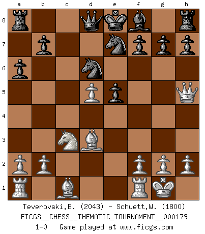 Last move : 1-0 2014 June 2 2:21:11 [Event "FICGS__CHESS__THEMATIC_TOURNAMENT__000179"] [Site "FICGS"] [Date "2014.04.05"] [Round "1"] [White "Teverovski,Bogoljub"] [Black "Schuett,Wilhelm"] [Result "1-0"] [WhiteElo "2043"] [BlackElo "1800"] 1.e4 c5 2.Nf3 a6 3.c4 Nc6 4.d4 cxd4 5.Nxd4 e5 6.Nf5 d5 7.cxd5 Bxf5 8.exf5 Nd4 9.Nc3 Nxf5 10.Bd3 Nge7 11.O-O Nd6 12.Qh5 1-0 Sicilian : O'Kelly variation Kingside Castling by player White (move 11) Player White won this chess game. Follow this game move after move (download)The most powerful weapon in Chess is to have the next move. (David Bronstein) Ja, ich habe einmal eine Blitzpartie gespielt, es war in einem Zug, 1929. --im Interview 1989 (Mikhail Moiseyevich Botvinik) Si tu oponente te ofrece un empate, trata de averiguar porque piensa él que esta en una posición peor. (Nigel Short) Vous m'avez demandé de vous exposer quel est le fondement de la prière. Je ne fais que préparer les pièces du jeu sur la table... Nous sera-t-il permis d'en adopter les règles et si nous les appliquons scrupuleusement nous ne tarderons pas à faire mat le Roi divin ! Il ne pourra échapper à nos mains. (Sainte Thérèse d'Avila, Chemin de perfection) CHESS, n. f. [echecs, Fr.] A nice and abstruse game, in which two sets of puppets are moved in opposition to each other. (Dr Samuel Johnson, A Dictionary Of The English Language, 1755)