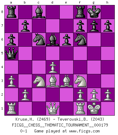 Last move : 0-1 2014 April 27 11:45:28 [Event "FICGS__CHESS__THEMATIC_TOURNAMENT__000179"] [Site "FICGS"] [Date "2014.04.05"] [Round "1"] [White "Kruse,Herbert"] [Black "Teverovski,Bogoljub"] [Result "0-1"] [WhiteElo "2469"] [BlackElo "2043"] 1.e4 c5 2.Nf3 a6 3.c3 d5 4.exd5 Qxd5 5.d4 Nf6 6.Be3 cxd4 7.cxd4 e6 8.Nc3 Qa5 9.Bd3 Nc6 10.a3 Bd6 11.O-O O-O 0-1 Sicilian : O'Kelly variation Kingside Castling by player White (move 11) Kingside Castling by player Black (move 11) Player Black won this chess game. Follow this game move after move (download)Chess is mental torture. (Garry Kasparov) Das Blackmar-Diemer-Gambit verändert den ganzen Menschen! (Emil Joseph Diemer) El Ajedrez es un juego terrible. Si no dominas el centro, tu oponente tiene una posición mas libre. Si tu tienes el centro, entonces realmente tienes algo de que preocuparte. (Siegbert Tarrasch) Demandez au pauvre Cg1 ce qu'il en pense. Eduard Gufeld à propos de la variante Saemisch de l'Est-Indienne. Life is painting a picture, not doing a sum. (Oliver Wendell Holmes, Jr.)