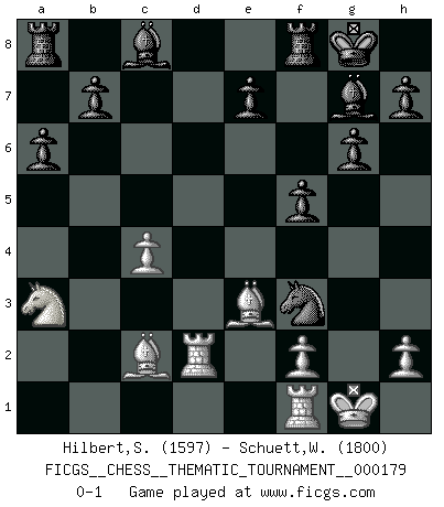 Last move : 0-1 2014 July 8 14:21:33 [Event "FICGS__CHESS__THEMATIC_TOURNAMENT__000179"] [Site "FICGS"] [Date "2014.04.05"] [Round "1"] [White "Hilbert,Stephan J."] [Black "Schuett,Wilhelm"] [Result "0-1"] [WhiteElo "1597"] [BlackElo "1800"] 1.e4 c5 2.Nf3 a6 3.b4 cxb4 4.a3 bxa3 5.Nxa3 d6 6.d4 g6 7.c4 Bg7 8.Bd3 Nf6 9.O-O O-O 10.Be3 Nc6 11.e5 dxe5 12.dxe5 Ng4 13.Qd2 Ngxe5 14.Rad1 Nxf3+ 15.gxf3 Ne5 16.Be4 Qxd2 17.Rxd2 f5 18.Bc2 Nxf3+ 0-1 Sicilian : O'Kelly variation Kingside Castling by player White (move 9) Kingside Castling by player Black (move 9) Player Black won this chess game. Follow this game move after move (download)I believe that Chess possesses a magic that is also a help in advanced age. A rheumatic knee is forgotten during a game of Chess and other events can seem quite unimportant in comparison with a catastrophe on the chessboard. (Vlastimil Hort) Sie bekommen vielleicht den Eindruck, dass die Spitzenspieler überhaupt gar nicht so stark sind. Aber das stimmt nicht. Es ist eine Illusion. Mit einem Computer an der Seite ist es sehr leicht, Urteile zu fällen, aber wenn man alleine am Brett sitzt, sieht die Sache ganz anders aus. (Vladimir Kramnik) El Ajedrez es despiadado: debes de estar preparado para matar gente. (Nigel Short) 'L'échange des dames est un coup dur pour les deux adversaires...' Un journaliste lors d'une partie du match Spassky-Fischer It's only after you lost everything, Tyler says, that you're free to do anything. (Chuck Palahniuk, Fight Club)