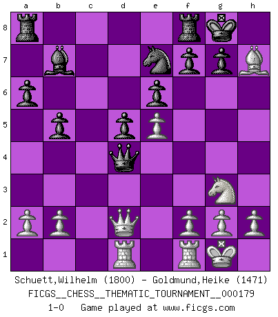 Last move : 1-0 2014 July 12 14:33:56 [Event "FICGS__CHESS__THEMATIC_TOURNAMENT__000179"] [Site "FICGS"] [Date "2014.04.05"] [Round "1"] [White "Schuett,Wilhelm"] [Black "Goldmund,Heike"] [Result "1-0"] [WhiteElo "1800"] [BlackElo "1471"] 1.e4 c5 2.Nf3 a6 3.c3 Nc6 4.d4 cxd4 5.cxd4 e6 6.Nc3 d5 7.e5 Bb4 8.Bd2 b5 9.Bd3 Nge7 10.O-O Qb6 11.Ne2 Bxd2 12.Qxd2 O-O 13.Rad1 Bb7 14.Ng3 Nxd4 15.Nxd4 Qxd4 16.Bxh7+ 1-0 Sicilian : O'Kelly variation Kingside Castling by player White (move 10) Kingside Castling by player Black (move 12) Player White won this chess game. Follow this game move after move (download)Even the laziest King flees wildly in the face of a double check ! (Aaron Nimzowitsch) Ein unbeabsichtigtes Patt ist der Gipfel der Dummheit. (Anonymous) Una buena memoria, concentración, imaginación y una fuerte voluntad, se requiere para llegar a ser un buen jugador. (Bobby Fischer) Les Echecs, c'est l'art de la guerre sans les charniers, c'est la résurrection des morts tombés au champ d'honneur, l'espoir perpétuel, la suprématie de l'intelligence sur la force, la culture de l'esprit. (F. Szpiner) If you are good, you will be assigned all the work. If you are really good, you will get out of it. (Dan Rotaru)