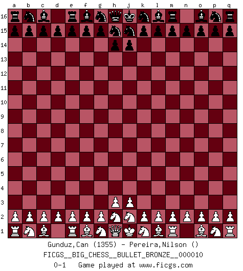 Last move : 0-1 2014 April 6 19:22:48 [Event "FICGS__BIG_CHESS__BULLET_BRONZE__000010"] [Site "FICGS"] [Date "2014.04.06"] [Round "1"] [White "Gunduz,Can"] [Black "Pereira,Nilson"] [Result "0-1"] [WhiteElo "1355"] [BlackElo ""] 0-1 This big chess game has been lost on time (started : 2014.04.06 13:7:41) Follow this game move after move (download)Fischer prefers to enter Chess history alone. (Miguel Najdorf) Alles was ich jemals tun will ist Schach spielen. (Robert James Fischer) No existe un remordimiento como el remordimiento del Ajedrez. (H. G. Wells) Aucun coup ne doit être joué sans but. (Pedro Damiano) Somewhere in the world there is an epigram for every dilemma. (Hendrik Willem van Loon)