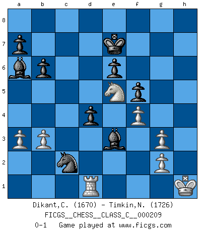 Last move : 0-1 2014 September 19 18:34:39 [Event "FICGS__CHESS__CLASS_C__000209"] [Site "FICGS"] [Date "2014.04.10"] [Round "1"] [White "Dikant,Christophe"] [Black "Timkin,Nikolay"] [Result "0-1"] [WhiteElo "1670"] [BlackElo "1726"] 1.d4 Nf6 2.Nf3 e6 3.e3 d5 4.Bd3 c5 5.b3 Nc6 6.Bb2 b6 7.O-O Bd6 8.Nbd2 O-O 9.Ne5 Bb7 10.f4 Rc8 11.a3 Nd7 12.Nxd7 Qxd7 13.dxc5 Bxc5 14.Bxh7+ Kxh7 15.Qh5+ Kg8 16.Bxg7 Bxe3+ 17.Kh1 f5 18.Qh8+ Kf7 19.Bxf8 Rxf8 20.Qh7+ Ke8 21.Qxd7+ Kxd7 22.Rad1 Nd4 23.Nf3 Nxc2 24.Ne5+ Kd6 25.Nc4+ Ke7 26.Ne5 Rg8 27.Rf3 d4 28.Rg3 Rxg3 29.hxg3 Ba6 0-1 Queen's pawn : Yusupov-Rubinstein system Kingside Castling by player White (move 7) Kingside Castling by player Black (move 8) Player Black won this chess game. Follow this game move after move (download)Chess is a terrible game. If you have no center, your opponent has a freer position. If you do have a center, then you really have something to worry about ! (Siegbert Tarrasch) Modernes Schach erfordert enorme Anspannung. Es ist für einen normalen Menschen unmöglich das auszuhalten. (Viktor Kortschnoi) Me dio la sensación de como si yo estuviera jugando en contra del mismo Ajedrez. - al estar jugando en contra de Robert Fischer (Walter Shipman) Des points faibles ou des trous dans la position de l'adversaire doivent être occupés par des pièces et non pas par des pions. (Siegbert Tarrasch) They say in chess you've got to kill the queen, and then you mate it... Oh I, do you ? (Red Hot Chili Peppers, Fortune faded)