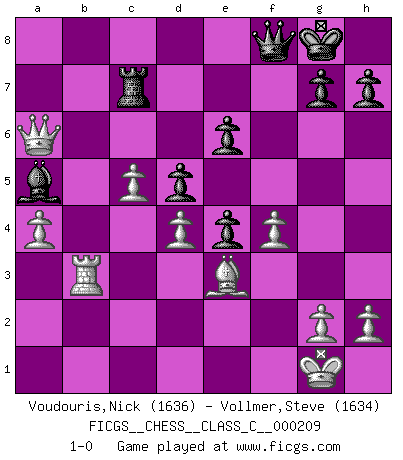 Last move : 1-0 2014 April 27 20:53:4 [Event "FICGS__CHESS__CLASS_C__000209"] [Site "FICGS"] [Date "2014.04.10"] [Round "1"] [White "Voudouris,Nick"] [Black "Vollmer,Steve"] [Result "1-0"] [WhiteElo "1636"] [BlackElo "1634"] 1.d4 d5 2.e3 Nf6 3.Bd3 c5 4.c3 cxd4 5.exd4 Nc6 6.f4 e6 7.Nf3 Bd6 8.O-O O-O 9.Ne5 Ne4 10.Qe2 f5 11.Nd2 Qc7 12.a4 Bd7 13.Ndf3 Rad8 14.Be3 Be8 15.c4 Qe7 16.Nxc6 Bxc6 17.c5 Bc7 18.b4 Rc8 19.Ne5 Rfd8 20.Nxc6 bxc6 21.b5 Ba5 22.Ra3 Rf8 23.Rb3 Rb8 24.Rfb1 Rbc8 25.bxc6 Rxc6 26.Bxe4 fxe4 27.Rb7 Rc7 28.R7b5 Bc3 29.R1b3 a6 30.Rb8 Ba5 31.Rxf8+ Qxf8 32.Qxa6 1-0 Queen's pawn : Stonewall attack Kingside Castling by player White (move 8) Kingside Castling by player Black (move 8) Player White won this chess game. Follow this game move after move (download)My opponents make good moves too. Sometimes I don't take these things into consideration. (Bobby Fischer) Es gibt keine einzige Frau, der ich nicht einen Springer vorgeben könnte und trotzdem gewänne. (Robert James Fischer) El juego de Damas es para vagabundos. (Paul Morphy) Avec des compensations pour le matériel en plus... (Anonyme) Two beer, or not two beer. (Unknown)