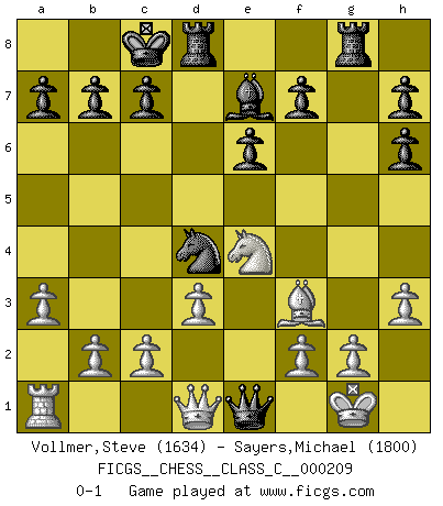 Last move : 0-1 2014 April 11 11:43:7 [Event "FICGS__CHESS__CLASS_C__000209"] [Site "FICGS"] [Date "2014.04.10"] [Round "1"] [White "Vollmer,Steve"] [Black "Sayers,Michael"] [Result "0-1"] [WhiteElo "1634"] [BlackElo "1800"] 1.e4 d5 2.exd5 Qxd5 3.Nf3 Bg4 4.Be2 Nc6 5.Nc3 Qa5 6.O-O e6 7.d3 O-O-O 8.Bd2 Be7 9.a3 Nh6 10.h3 Bxf3 11.Bxf3 Nd4 12.Bxh6 gxh6 13.Re1 Rhg8 14.Ne4 Qxe1+ 0-1 Scandinavian (centre counter) defense Kingside Castling by player White (move 6) Queenside Castling by player Black (move 7) Player Black won this chess game. Follow this game move after move (download)For surely of all the drugs in the world, Chess must be the most permanently pleasurable. (Assiac) Gewinnen beim Schach fördert das Selbstvertrauen. Beim Sex spüre ich sowas nicht... (Garry Kasparov) El Ajedrez se juega con la mente... ¡no con las manos!. (Renaud y Kahn) On peut tirer plus d'utilité d'une partie perdue que de 100 parties gagnées. (Capablanca) The real danger is not that computers will begin to think like men, but that men will begin to think like computers. (Sydney J. Harris)