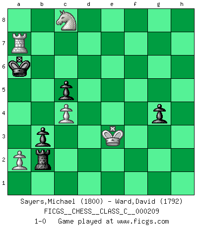 Last move : 1-0 2014 August 3 4:6:58 [Event "FICGS__CHESS__CLASS_C__000209"] [Site "FICGS"] [Date "2014.04.10"] [Round "1"] [White "Sayers,Michael"] [Black "Ward,David"] [Result "1-0"] [WhiteElo "1800"] [BlackElo "1792"] 1.e4 e5 2.f4 exf4 3.Bc4 d6 4.Nf3 h6 5.O-O Nc6 6.d4 g5 7.c3 Bg7 8.Qa4 Bd7 9.Qb3 Na5 10.Bxf7+ Kf8 11.Qa3 Kxf7 12.Qxa5 c5 13.Qxd8 Rxd8 14.dxc5 dxc5 15.Na3 Ne7 16.h4 Bf6 17.hxg5 Bxg5 18.Ne5+ Ke6 19.Nd3 b6 20.Nxf4+ Kd6 21.Nd5 Nxd5 22.Bxg5 hxg5 23.exd5 Kxd5 24.Rad1+ Kc6 25.Rf6+ Kb7 26.Rd5 g4 27.Nc4 Bc6 28.Rxd8 Rxd8 29.Ne5 Rd1+ 30.Kf2 Rd2+ 31.Ke3 Rxg2 32.Rf7+ Ka6 33.Nxc6 b5 34.Nxa7 Rxb2 35.Nc8 b4 36.c4 b3 37.Ra7+ 1-0 KGA : Bishop's gambit Kingside Castling by player White (move 5) 10 pieces endgame at move 34 : White KRNPP , Black KRPPP WHITE : King + 1 Rook 1 Knight 2 Pawns BLACK : King + 1 Rook 3 Pawns Player White won this chess game. Follow this game move after move (download)If a ruler does not understand Chess, how can he rule over a kingdom ? (King Khusros II) Pläne sind die Träume des Verständigen. (Ernst Freiherr von Feuchtersleben) Todavía soy una víctima del Ajedrez. Tiene toda la belleza del arte y mucho mas. No puede ser comercializado. El Ajedrez es mas puro que el arte en su posición social. (Marcel Duchamp) Des points faibles ou des trous dans la position de l'adversaire doivent être occupés par des pièces et non pas par des pions. (Siegbert Tarrasch) All politicians must be presumed guilty until they are proven innocent. (Dinesh De Silva)