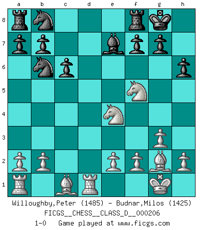Last move : 1-0 2014 May 8 13:49:4 [Event "FICGS__CHESS__CLASS_D__000206"] [Site "FICGS"] [Date "2014.04.10"] [Round "1"] [White "Willoughby,Peter"] [Black "Budnar,Milos"] [Result "1-0"] [WhiteElo "1485"] [BlackElo "1425"] 1.c4 Nf6 2.g3 e5 3.Bg2 d5 4.cxd5 Nxd5 5.Nc3 Nb6 6.d3 c6 7.Nf3 Bd6 8.O-O O-O 9.Ne4 h6 10.d4 exd4 11.Qxd4 Be7 12.Rd1 Qxd4 13.Nxd4 Bf5 14.Nxf5 1-0 English, 1...Nf6 (Anglo-Indian defense) Kingside Castling by player White (move 8) Kingside Castling by player Black (move 8) Player White won this chess game. Follow this game move after move (download)What is the object of playing a gambit opening?... To acquire a reputation of being a dashing player at the cost of losing a game. (Siegbert Tarrasch) Glücklicherweise sind Großmeister Ruben Fines reine Schachbücher weniger phallozentrisch [als seine Schachpsychologie] und deswegen auch weniger lächerlich. (Nigel Short) Antes de los Finales, los dioses han colocado el Juego Medio. (Siegbert Tarrasch) Donnez-moi un Cavalier en 6e et je gagnerais toutes mes parties. (Steinitz) Nobody is always a winner, and anybody who says he is, is either a liar or doesn't play poker. (Amarillo Slim)