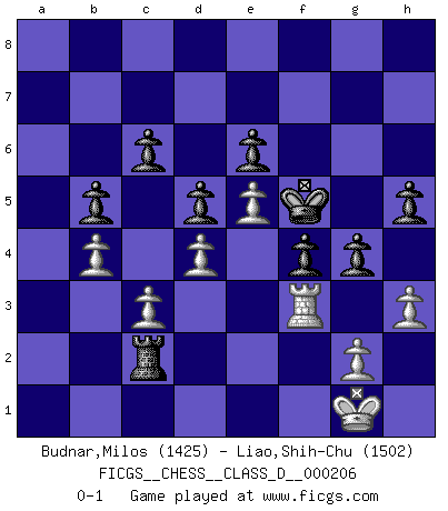 Last move : 0-1 2014 September 14 17:13:59 [Event "FICGS__CHESS__CLASS_D__000206"] [Site "FICGS"] [Date "2014.04.10"] [Round "1"] [White "Budnar,Milos"] [Black "Liao,Shih-Chu"] [Result "0-1"] [WhiteElo "1425"] [BlackElo "1502"] 1.e4 c6 2.d4 d5 3.e5 e6 4.Nf3 h6 5.Bd3 Ne7 6.O-O Nf5 7.Bxf5 exf5 8.Nc3 Be6 9.h3 Be7 10.a3 Nd7 11.Na4 b5 12.Nc3 a6 13.b4 a5 14.Bd2 axb4 15.axb4 Rxa1 16.Qxa1 O-O 17.Ne2 Nb6 18.c3 Nc4 19.Nf4 Nxd2 20.Nxd2 Bg5 21.Nxe6 fxe6 22.f4 Bh4 23.Nf3 Bg3 24.Nh2 Qh4 25.Qc1 Ra8 26.Qb2 Bxf4 27.Qf2 Bg3 28.Qf3 Bxh2+ 29.Kxh2 Ra2 30.Qg3 Qxg3+ 31.Kxg3 Rc2 32.Rf3 g5 33.Rd3 h5 34.Kh2 Kg7 35.Kg1 Kg6 36.Kh2 f4 37.Rf3 Kf5 38.Kg1 g4 0-1 Caro-Kann : Advance variation Kingside Castling by player White (move 6) Kingside Castling by player Black (move 16) Player Black won this chess game. Follow this game move after move (download)Bobby Fischer is the greatest Chess player who has ever lived. (Ken Smith) Ich würde mich als ganz normalen Jungen bezeichnen [Im Alter von 12]. (Sergej Karjakin) El Ajedrez es una manera fabulosa para que los niños aprendan a autovalorarse y a autoestimarse. (Saudin Robovic) Lorsque vous vous retrouvez devant une position atroce, ne tendez pas un ultime piège dérisoire avec l'intention d'abandonner si l'adversaire le déjoue ! Faites-vous plutôt un devoir de résister comme si votre vie en dépendait. Jouez le coup qui vous déplairait au centuple si vous étiez dans la peau de votre tortionnaire ! Luck has a peculiar habit of favoring those who don't depend on it. (Author unknown)
