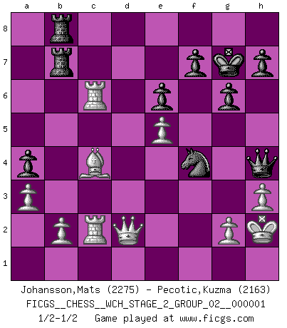 Last move : 1/2-1/2 2007 May 3 10:8:10 [Event "FICGS__CHESS__WCH_STAGE_2_GROUP_02__000001"] [Site "FICGS"] [Date "2007.02.15"] [Round "1"] [White "Johansson,Mats"] [Black "Pecotic,Kuzma"] [Result "1/2-1/2"] [WhiteElo "2275"] [BlackElo "2163"] 1.d4 d5 2.c4 dxc4 3.Nf3 e6 4.e3 Nf6 5.Bxc4 c5 6.O-O a6 7.Bb3 Nc6 8.Qe2 cxd4 9.Rd1 d3 10.Rxd3 Qc7 11.Nc3 Bc5 12.h3 O-O 13.e4 Nd7 14.Be3 Nce5 15.Nxe5 Nxe5 16.R3d1 Bxe3 17.Qxe3 Bd7 18.Rac1 Bc6 19.Ne2 a5 20.Rc5 a4 21.Bc2 Ra5 22.Rc3 Rb5 23.Rb1 Ra8 24.f4 Ng6 25.Nd4 Rb4 26.Nxc6 bxc6 27.a3 Rb6 28.e5 Qb8 29.Kh2 Ne7 30.Qf2 g6 31.Bd1 Kg7 32.Rc4 Rba6 33.Rbc1 Qb6 34.Qd2 Rd8 35.Qe2 Qa7 36.Qe1 Rb8 37.Qd2 Nd5 38.Bf3 Rab6 39.Qf2 Qa5 40.R1c2 Rb3 41.Rc5 Qd8 42.Rxc6 Nxf4 43.Be2 Qg5 44.Bc4 R3b7 45.Qd4 Qh4 46.Qd2 1/2-1/2 QGA : 3.Nf3 Kingside Castling by player White (move 6) Kingside Castling by player Black (move 12) This chess game ended in a draw. Follow this game move after move (download)Up to this point White has been following well-known analysis. But now he makes a fatal error: he begins to use his own head. (Siegbert Tarrasch) Wenn Du nicht kämpfst, um anderen etwas zu beweisen, sondern nur für Dich selbst, dann bist du fast unbesiegbar. (Garry Kasparov) Los finales de Peón son del Ajedrez lo que el cesped es del Golf. (Cecil Purdy) Lorsque vous vous retrouvez devant une position atroce, ne tendez pas un ultime piège dérisoire avec l'intention d'abandonner si l'adversaire le déjoue ! Faites-vous plutôt un devoir de résister comme si votre vie en dépendait. Jouez le coup qui vous déplairait au centuple si vous étiez dans la peau de votre tortionnaire ! It's not a bug - it's an undocumented feature. (Anonymous)