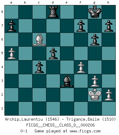 Last move : 0-1 2014 May 3 20:18:3 [Event "FICGS__CHESS__CLASS_D__000206"] [Site "FICGS"] [Date "2014.04.10"] [Round "1"] [White "Archip,Laurentiu"] [Black "Trigance,Emile"] [Result "0-1"] [WhiteElo "1546"] [BlackElo "1510"] 1.c4 e6 2.Nf3 d5 3.cxd5 exd5 4.g3 g6 5.Bg2 Bg7 6.O-O Ne7 7.d4 Nbc6 8.Nc3 O-O 9.a3 Bg4 10.Be3 Nf5 11.Qd2 Nxe3 12.fxe3 Ne7 13.b4 c6 14.a4 Re8 15.b5 Bxf3 16.exf3 Nf5 17.Rfe1 Qb6 18.Bh3 Nxe3 19.Rxe3 Rxe3 20.a5 Qxd4 21.Qxd4 Bxd4 22.Kg2 Bxc3 23.Ra3 Bd4 24.Rxe3 Bxe3 25.bxc6 bxc6 26.Bd7 c5 27.Bc6 Rd8 28.f4 c4 0-1 English Opening : Agincourt variation Kingside Castling by player White (move 6) Kingside Castling by player Black (move 8) Player Black won this chess game. Follow this game move after move (download)Chess, like love, is infectious at any age. (Flohr) Bis zum Jahr 1971 verlief in meiner Schachkariere alles glatt. Dieses dramatische Match [Fischer-Taimanov 6:0] machte mein Leben zur Hölle. (Mark Taimanov) El ganar no lo es todo... pero el perder es nada. (Mednis) On croit qu'il y a plus de mauvais joueurs que de bons joueurs, c'est faux : Il y a autant de joueurs qui gagnent que de joueurs qui perdent. (Philippe Geluck) Life is pain my dear and anyone who says otherwise is selling something. (Princess Bride)