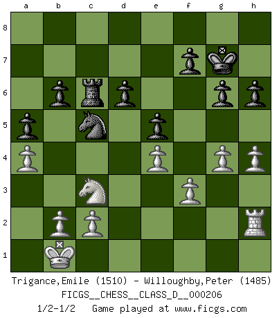 Last move : 1/2-1/2 2014 May 2 11:42:18 [Event "FICGS__CHESS__CLASS_D__000206"] [Site "FICGS"] [Date "2014.04.10"] [Round "1"] [White "Trigance,Emile"] [Black "Willoughby,Peter"] [Result "1/2-1/2"] [WhiteElo "1510"] [BlackElo "1485"] 1.e4 g6 2.d4 Bg7 3.Nf3 c5 4.Nc3 cxd4 5.Nxd4 Nc6 6.Be3 Qa5 7.Qd2 Nf6 8.f3 O-O 9.Nb3 Qd8 10.Bh6 b6 11.Bxg7 Kxg7 12.O-O-O a5 13.Bb5 Ba6 14.a4 Bxb5 15.Nxb5 Na7 16.Qd3 Nxb5 17.Qxb5 Ra7 18.g4 Qc7 19.Rd3 d6 20.Rc3 Qb8 21.Nd4 Rc7 22.Rxc7 Qxc7 23.h4 e5 24.Ne2 Rc8 25.Nc3 Nd7 26.Rh2 Nc5 27.Nd5 Qc6 28.Qxc6 Rxc6 29.Nc3 h6 30.Kb1 1/2-1/2 Robatsch (Modern) defense Kingside Castling by player Black (move 8) Queenside Castling by player White (move 12) This chess game ended in a draw. Follow this game move after move (download)When I asked Fischer why he had not played a certain move in our game, he replied: 'Well, you laughed when I wrote it down !' (Mikhail Tal) Korrekt heißt in Deutschland die Haltung eines Mannes, dessen Benehmen nach dem Urteile seiner Nachbarn seiner Stellung angemessen ist. Um korrekt zu sein, muß man sich der Meinung der anderen anpassen... (Emanuel Lasker) Con o sin el título, Bobby Fischer fue sin lugar a dudas el mas grande jugador de su época. (Burt Hochberg) Nous sommes les pions de la mystérieuse partie d'Echecs jouée par Dieu. Il nous déplace, nous arrête, nous pousse encore, puis nous lance un à un dans la boîte du Néant. Epitaphe sur la tombe de David Janowsky (1868-1927). I know the human being and fish can coexist peacefully. (George W. Bush, Saginaw sept. 29, 2000)