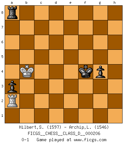 Last move : 0-1 2014 August 16 14:14:35 [Event "FICGS__CHESS__CLASS_D__000206"] [Site "FICGS"] [Date "2014.04.10"] [Round "1"] [White "Hilbert,Stephan J."] [Black "Archip,Laurentiu"] [Result "0-1"] [WhiteElo "1597"] [BlackElo "1546"] 1.b4 d5 2.Bb2 Nf6 3.e3 g6 4.Nf3 Bg7 5.Be2 O-O 6.d3 e6 7.Nbd2 Nbd7 8.O-O b5 9.c4 dxc4 10.dxc4 bxc4 11.Nxc4 a6 12.Nfe5 Nxe5 13.Nxe5 Bb7 14.Bf3 Qxd1 15.Raxd1 Bxf3 16.Nxf3 a5 17.b5 a4 18.a3 Rab8 19.Nd4 Nd5 20.e4 Ne7 21.Rb1 Rb6 22.Rfc1 Rc8 23.Nc6 Nxc6 24.Rxc6 Rxb5 25.Rc2 c5 26.f4 Rcb8 27.e5 f6 28.Re2 fxe5 29.fxe5 Kf7 30.Rf1+ Ke7 31.Bc1 h6 32.Bf4 c4 33.Rc1 Rc8 34.Rec2 Bxe5 35.Bxh6 c3 36.Bg5+ Ke8 37.Be3 Rc7 38.h3 Rb3 39.Bb6 Rc6 40.Be3 Rxa3 41.Rd1 Rd6 42.Rxd6 Bxd6 43.Bd4 Bb4 44.Kf2 Rb3 45.Ke3 a3 46.Kd3 Rb2 47.Bxc3 Bxc3 48.Kxc3 Rb8 49.Ra2 Ra8 50.Kd4 Ke7 51.g4 Kf6 52.Ke4 Ra4+ 53.Ke3 Kg5 54.Kf3 Kh4 55.Kg2 e5 56.Kh2 e4 57.Kg2 e3 58.Kf3 Kxh3 59.g5 Kh4 60.Kxe3 Kxg5 61.Kd3 Kf4 62.Kc3 g5 63.Kb3 Ra8 64.Kb4 g4 0-1 Polish (Sokolsky) opening Kingside Castling by player Black (move 5) Kingside Castling by player White (move 8) 10 pieces endgame at move 47 : White KRPP , Black KRBPPP WHITE : King + 1 Rook 2 Pawns BLACK : King + 1 Rook 1 Bishop 3 Pawns 9 pieces endgame at move 48 : White KRPP , Black KRPPP WHITE : King + 1 Rook 2 Pawns BLACK : King + 1 Rook 3 Pawns 8 pieces endgame at move 58 : White KRP , Black KRPPP WHITE : King + 1 Rook 1 Pawn BLACK : King + 1 Rook 3 Pawns 7 pieces endgame at move 60 : White KRP , Black KRPP WHITE : King + 1 Rook 1 Pawn BLACK : King + 1 Rook 2 Pawns 6 pieces endgame at move 60 : White KR , Black KRPP WHITE : King + 1 Rook BLACK : King + 1 Rook 2 Pawns Player Black won this chess game. Follow this game move after move (download)Though most people love to look at the games of the great attacking masters, some of the most successful players in history have been the quiet positional players. They slowly grind you down by taking away your space, tying up your pieces, and leaving you with virtually nothing to do ! (Yasser Seirawan) Wenn du nicht weißt was du tun sollst, warte bis dein Gegner eine Idee hat. Sie wird sicher schlecht sein. (Siegbert Tarrasch) La esencia del Ajedrez es pensar acerca de lo que el Ajedrez es. (David Bronstein) Les échecs sont un jeu terrible. Si vous n'avez pas le centre, votre adversaire a une position plus libre. Par contre, si vous avez le centre, alors vous avez vraiment quelque chose pour laquelle vous inquiéter ! (Siegbert Tarrasch) Wisdom is the reward you get for a lifetime of listening when you'd have preferred to talk. (Doug Larson)