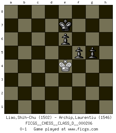 Last move : 0-1 2014 August 10 16:32:30 [Event "FICGS__CHESS__CLASS_D__000206"] [Site "FICGS"] [Date "2014.04.10"] [Round "1"] [White "Liao,Shih-Chu"] [Black "Archip,Laurentiu"] [Result "0-1"] [WhiteElo "1502"] [BlackElo "1546"] 1.e4 d5 2.e5 c5 3.h3 g6 4.d4 c4 5.Nf3 Bg7 6.c3 Nc6 7.b3 b5 8.b4 a5 9.a3 axb4 10.cxb4 Nxb4 11.Bb2 Nc6 12.Bc3 b4 13.axb4 Rxa1 14.Bxa1 Qb6 15.Bc3 Nxb4 16.Qa4+ Nc6 17.Be2 Qxb1+ 18.Bd1 Qb7 19.O-O Bd7 20.Bc2 Nxd4 21.Qa2 Ne2+ 22.Kh1 Nxc3 23.Qa3 Nb5 24.Qb4 Nd6 25.Qa5 Nb5 26.Rb1 Nh6 27.Ba4 O-O 28.Bxb5 Bxb5 29.Rxb5 Qa8 30.Qxa8 Rxa8 31.Rxd5 c3 32.Rc5 Ra3 33.Rc8+ Bf8 34.Ng5 Ra2 35.Rxc3 Rxf2 36.Rf3 Rxf3 37.Nxf3 Nf5 38.g4 Ng7 39.Ng5 e6 40.Kg2 h5 41.Kg3 hxg4 42.hxg4 Bc5 43.Ne4 Bd4 44.Kf4 Ne8 45.g5 Nc7 46.Nf6+ Kf8 47.Ke4 Bb2 48.Nd7+ Ke7 49.Nb6 Nb5 50.Nc4 Bc1 51.Ne3 Na7 52.Kf3 Nc6 53.Nc4 Bxg5 54.Kg4 Bh6 55.Kf3 Bg7 56.Kf4 Nxe5 57.Nxe5 Bxe5+ 58.Kxe5 g5 59.Ke4 f5+ 0-1 Scandinavian (centre counter) defense Kingside Castling by player White (move 19) Kingside Castling by player Black (move 27) 10 pieces endgame at move 42 : White KNPP , Black KBNPPP WHITE : King + 1 Knight 2 Pawns BLACK : King + 1 Bishop 1 Knight 3 Pawns 9 pieces endgame at move 53 : White KNP , Black KBNPPP WHITE : King + 1 Knight 1 Pawn BLACK : King + 1 Bishop 1 Knight 3 Pawns 8 pieces endgame at move 56 : White KN , Black KBNPPP WHITE : King + 1 Knight BLACK : King + 1 Bishop 1 Knight 3 Pawns 7 pieces endgame at move 57 : White KN , Black KBPPP WHITE : King + 1 Knight BLACK : King + 1 Bishop 3 Pawns 6 pieces endgame at move 57 : White K , Black KBPPP WHITE : King + BLACK : King + 1 Bishop 3 Pawns 5 pieces endgame at move 58 : White K , Black KPPP WHITE : King + BLACK : King + 3 Pawns Player Black won this chess game. Follow this game move after move (download)Everything is in a state of flux, and this includes the world of Chess. (Mikhail Botvinnik) Ich spiele 70 Eröffnungssysteme. (Viktor Kortschnoi) Fischer no está bajo la obligación de nadie. (Joseph Platz) Tout change constamment, y compris dans le monde des Echecs. (Botvinnik) Better than a thousand days of diligent study is one day with a great teacher. (Japanese proverb)
